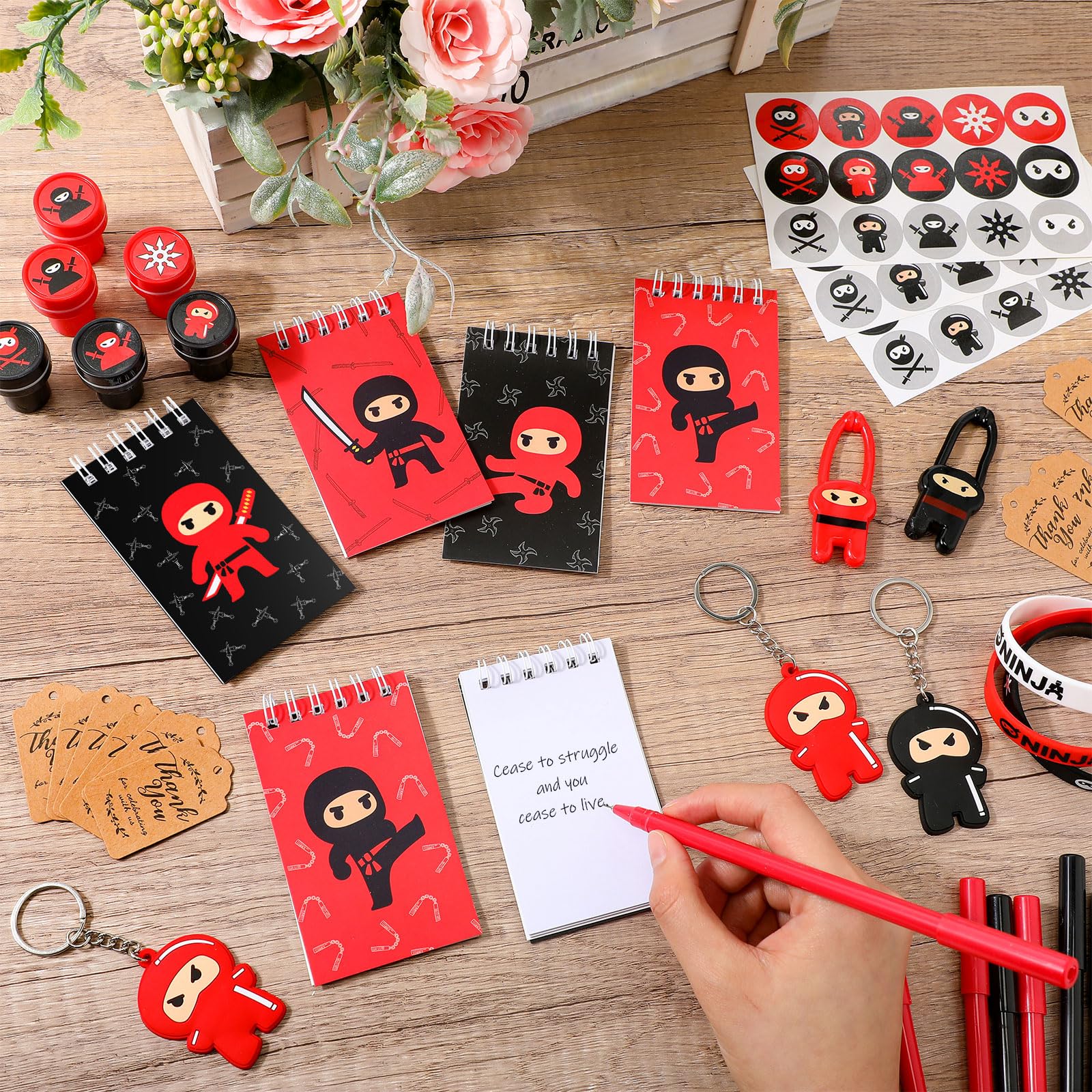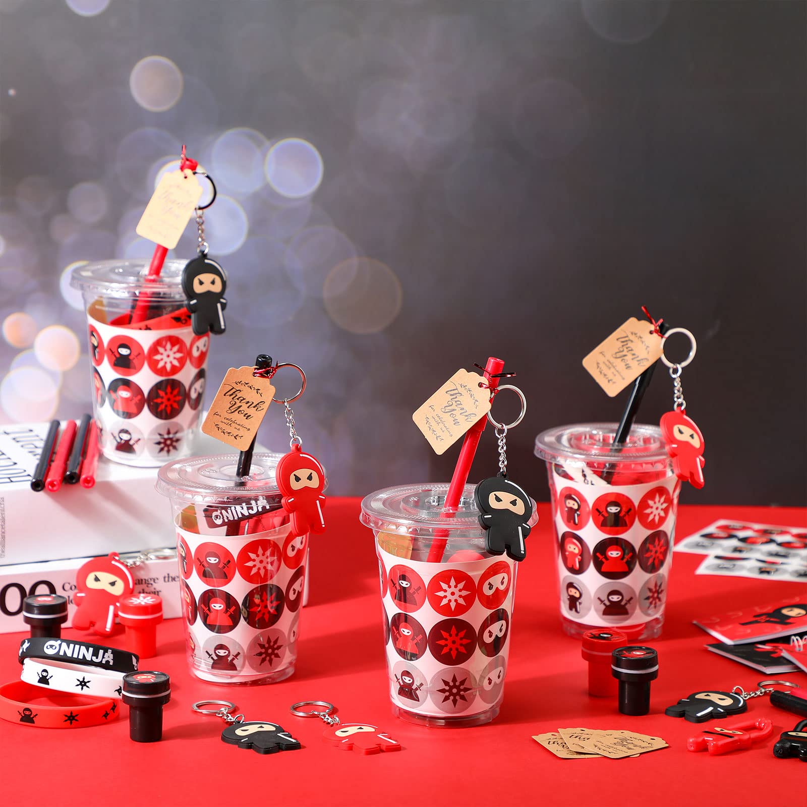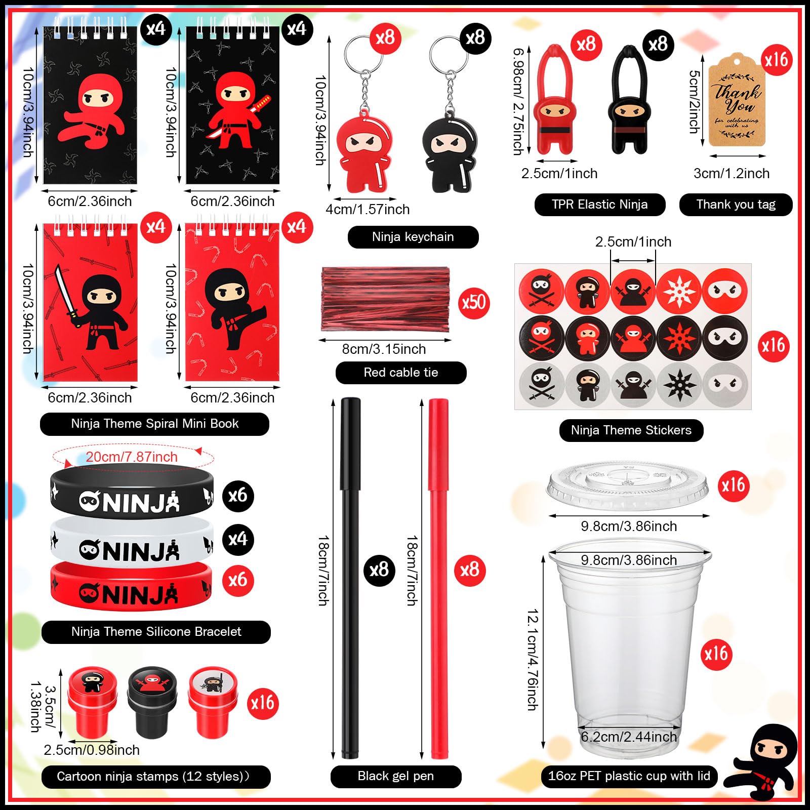 Features: These items are available in enough quantity and styles to meet your daily gift giving or party needs, ninja element can help add more fun to all your parties and events. Ninja kids merch is suitable for warrior theme parties, warrior theme parties, birthday theme parties. They are also ideal for family gatherings and classroom activities, club gift items, and competitions rewards. Specifications: Material: TPR, PET, kraft paper, silicone and othersColor: black and redSizes: Stretchy flying ninjas toy: 3.94 x 4.72 inches/ 10 x 12 cmCup with lid: 3.86 x 4.76 inches/ 9.8 x 12.1 cm, 16 ozSticker sheet with 15 small stickers on it: 5.7 x 3.5 inches/ 14.47 x 8.89 cmMini notebook: 2.36 x 3.94 inches/ 6 x 10 cmKeychain: 4 x 1.57 inches/ 10.16 x 4 cmThank you card: 1.18 x 1.97 inches/ 3 x 5 cmStamps and stickers: the proper sizes for cupsPackage includes: 16 x Cups 16 x Cup lids16 x Mini notebooks16 x Pens16 x Ninja keychains16 x Silicone bracelets16 x Action figures16 x Stamps16 x Stickers (sheets)16 x Thank you cards50 x Tie wire (1 pack)Notes: Manual measurement, please allow slight errors on size. The color may exist a slight difference due to different screen displays. Children under 12 years old should use this product under the supervision of adults.