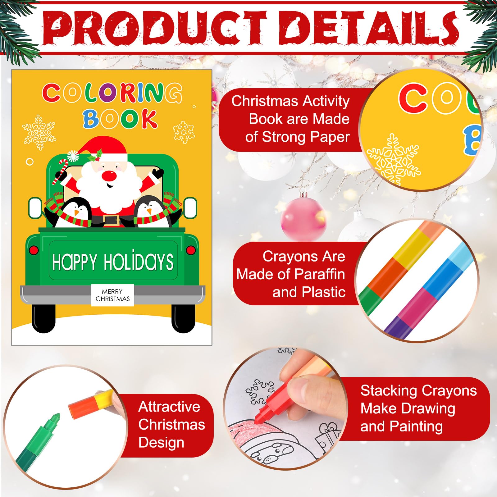 Zhanmai 64 Pcs Christmas Coloring Book with Stacking Crayons for Kids Bulk Santa Claus Snowman Elk Penguin Elf Gingerbread Holid