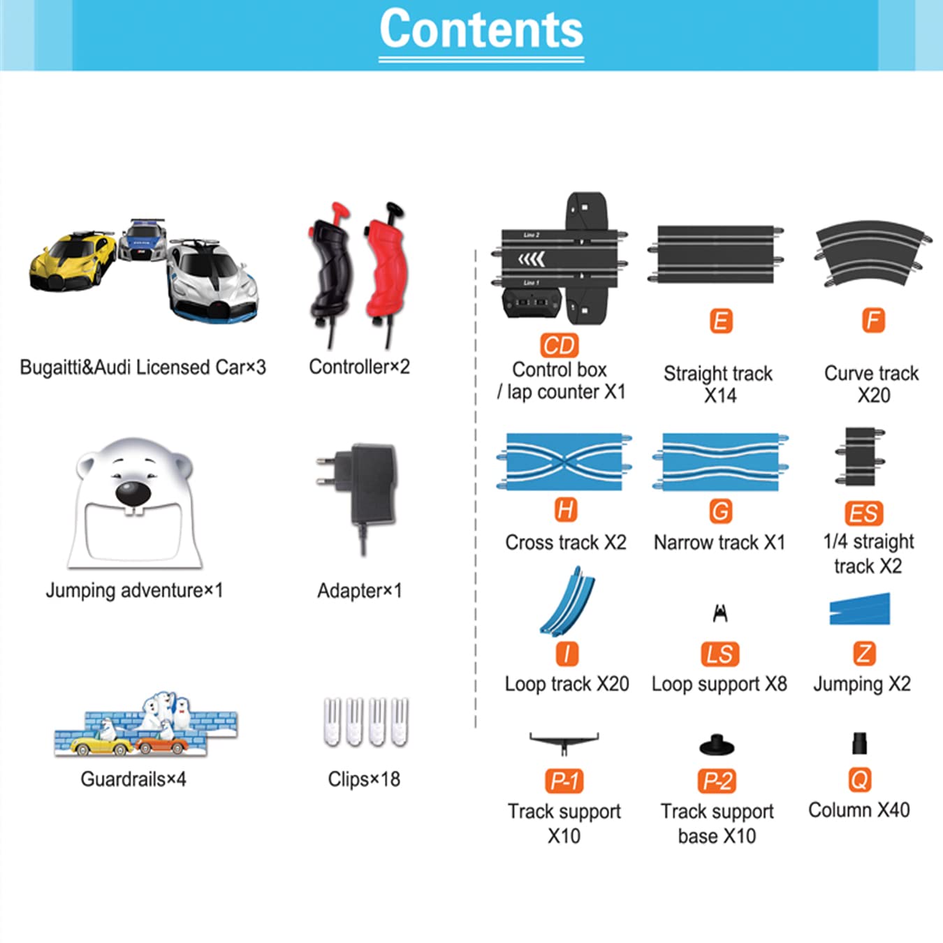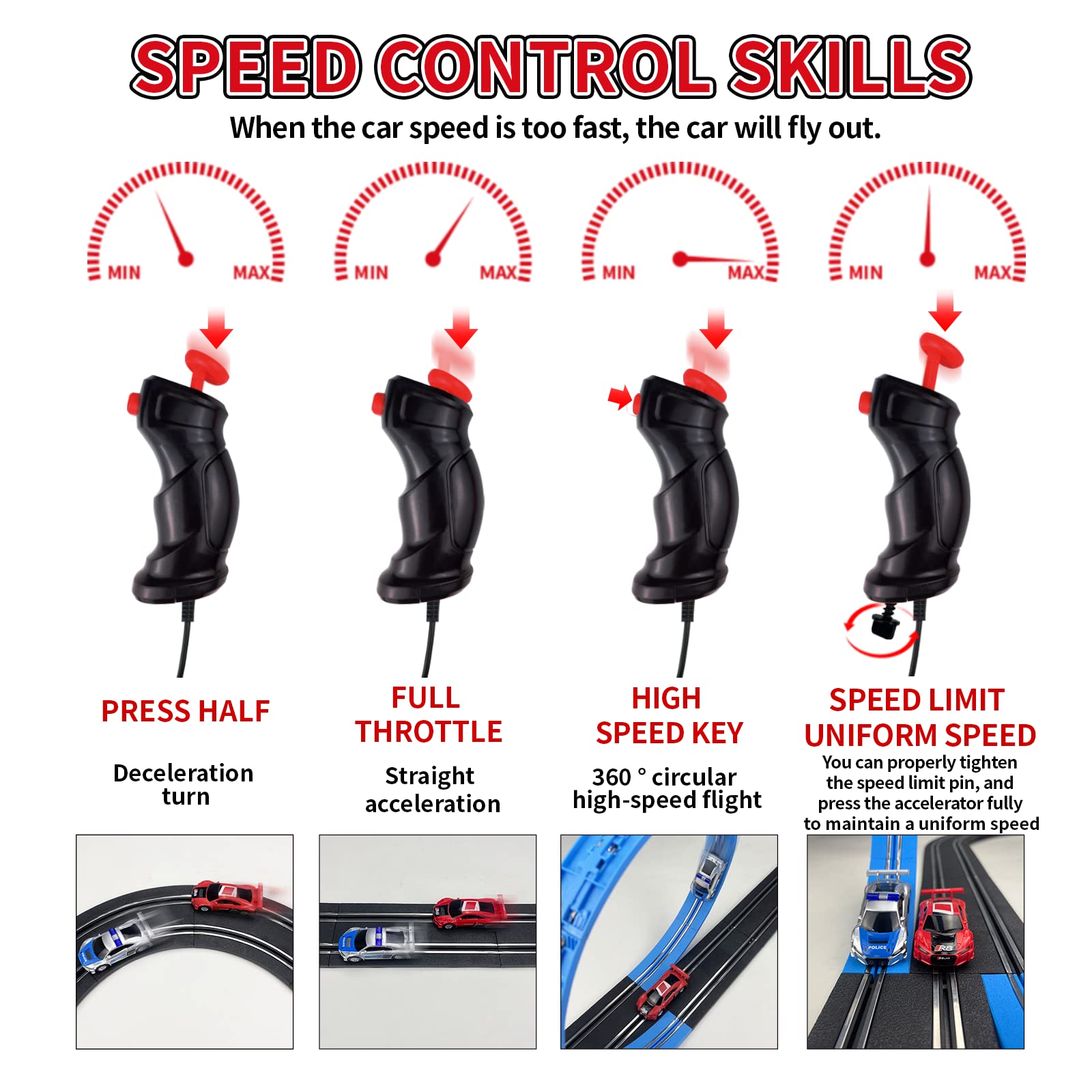 Easy-Build And Dis-Assemble Track Design:New Design Track Is Easy To Put Together. Please Make Sure That The Track Pieces Are Completely Snapped Together.Here Are Many Combinations Can Be Installed.The Loop Increases The Playability Of The Product And The Difficulty Of Racing, Which Will Be More Exciting And Fun For Older Children.