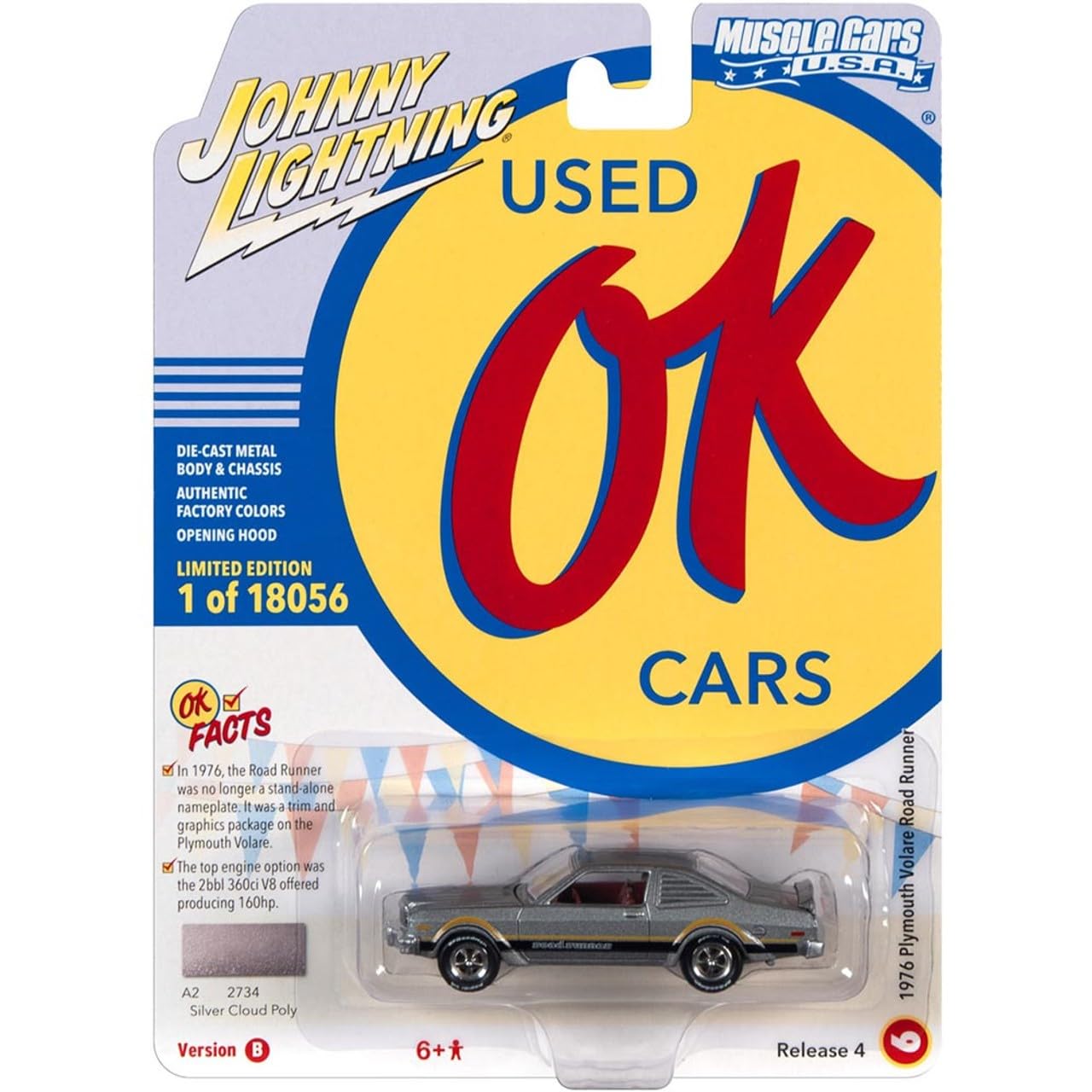 - Q: What color is the Johnny Lightning - 1976 Plymouth Road Runner model? A: The model features a striking Silver Cloud Poly finish complemented by black and orange side stripes and a detailed Road Runner side script.