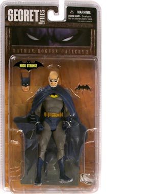 • Q: What is included with the DC Direct Secret Files Series 3: Batman Rogues Gallery 2 Hugo Strange action figure? A: The DC Direct Secret Files Series 3: Batman Rogues Gallery 2 Hugo Strange action figure includes the figure itself, an alternative Batman head, and comes in clam-shell 4-color blister card packaging.