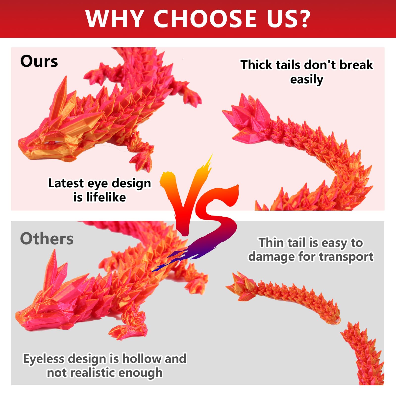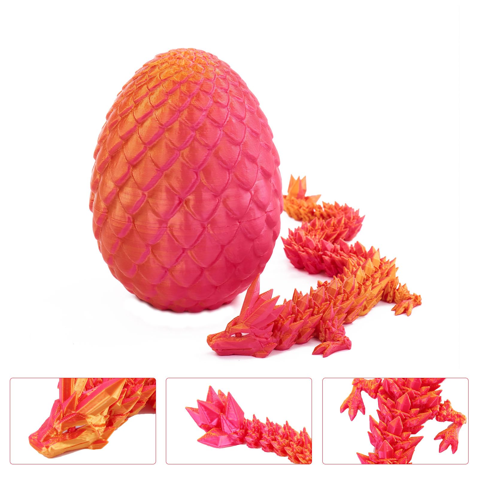 PLA material: this is an environmentally friendly, no-toxic, odorless material used to create our 3D crystal articulated dragon egg is the most suitable for toys!. | This is the latest 3D dragon complete with design, the eye embellishment can only make the whole dragon more lifelike and realistic. | Extraordinary Design: The precise curvature and graduated color palette of the 3D printed dragon eggs bring the scales layered and textured to life, creating a tactile and visual sense of depth and realism. | Durable Tail: Thickened and enlarged design makes the tail more wild and at the same time increases its durability, it will not be easily broken and damaged. | Flexible Design:3D printed dragon's entire body is connected by a sturdy hinge,allowing for positioning and posing. Adds a more artistic placement design to the Collectible.