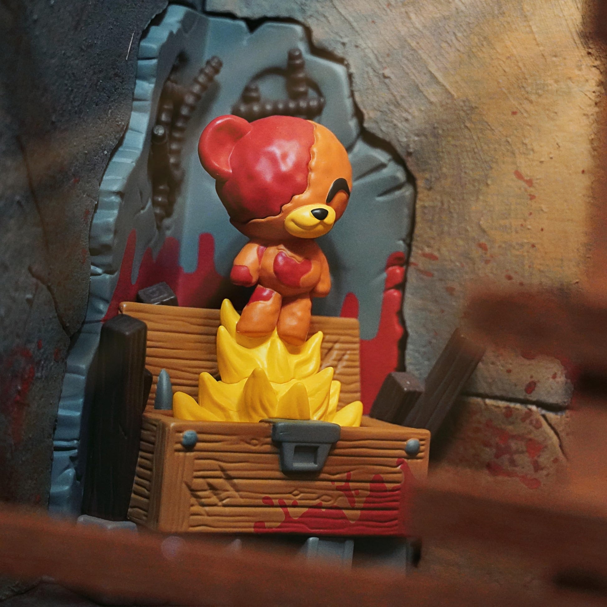 Youtooz Call of Duty Mystery Box Vinyl Figure: This Mystery Box figure has a 1 in 6 chance for a Chase version which replaces the Teddy with a powerful raygun! At 4.9 inches tall and set against a backdrop of cold grey cement with exposed metal rebar, large chunks gouged out, and wooden planks strewn to the sides. The Mystery Box has been flung open as yellow flames emerge from its depths to reveal your