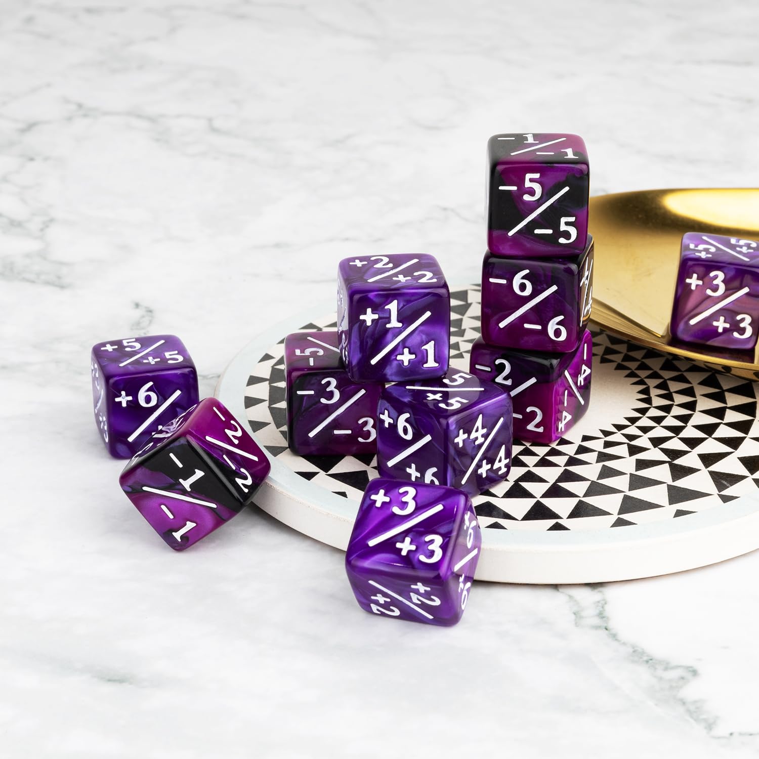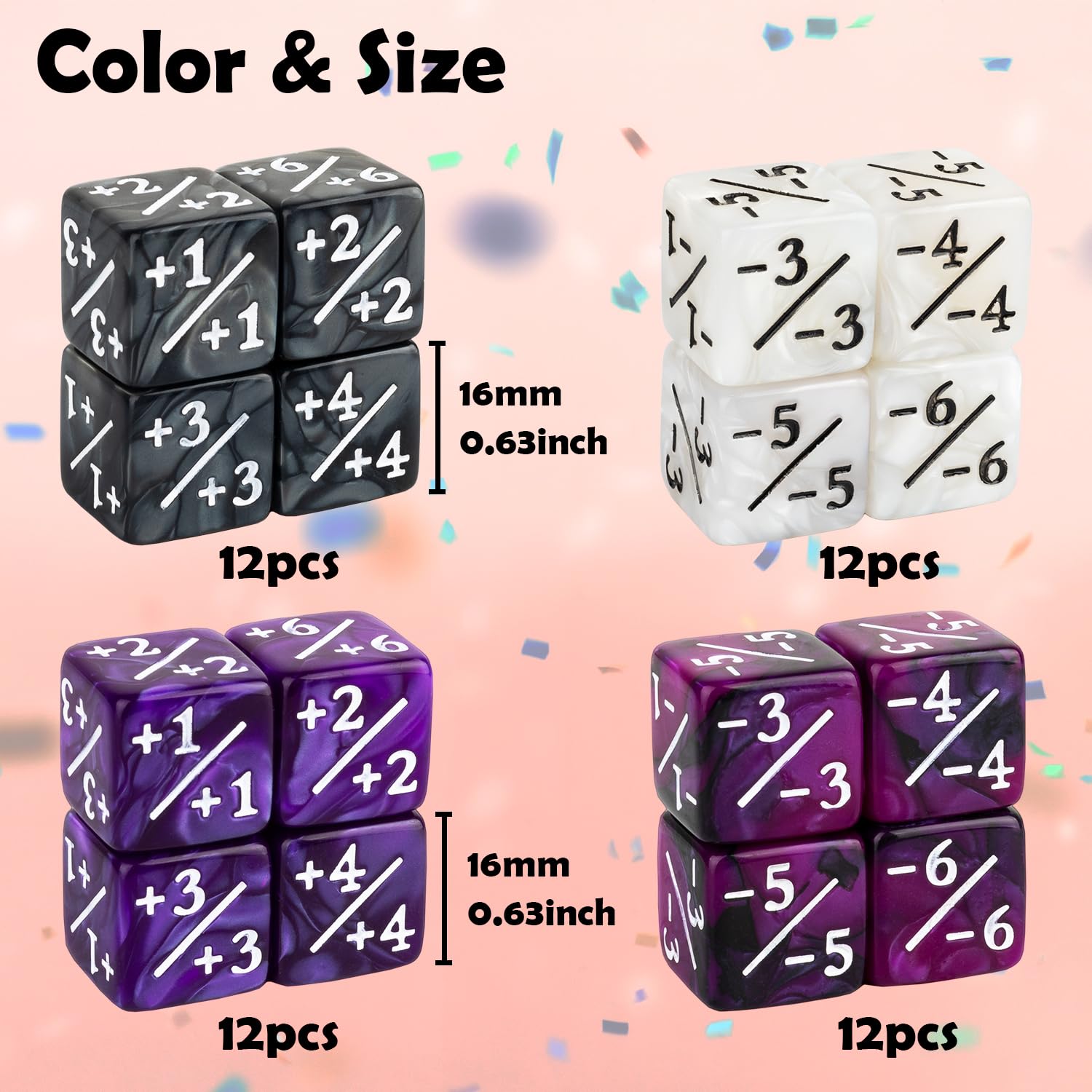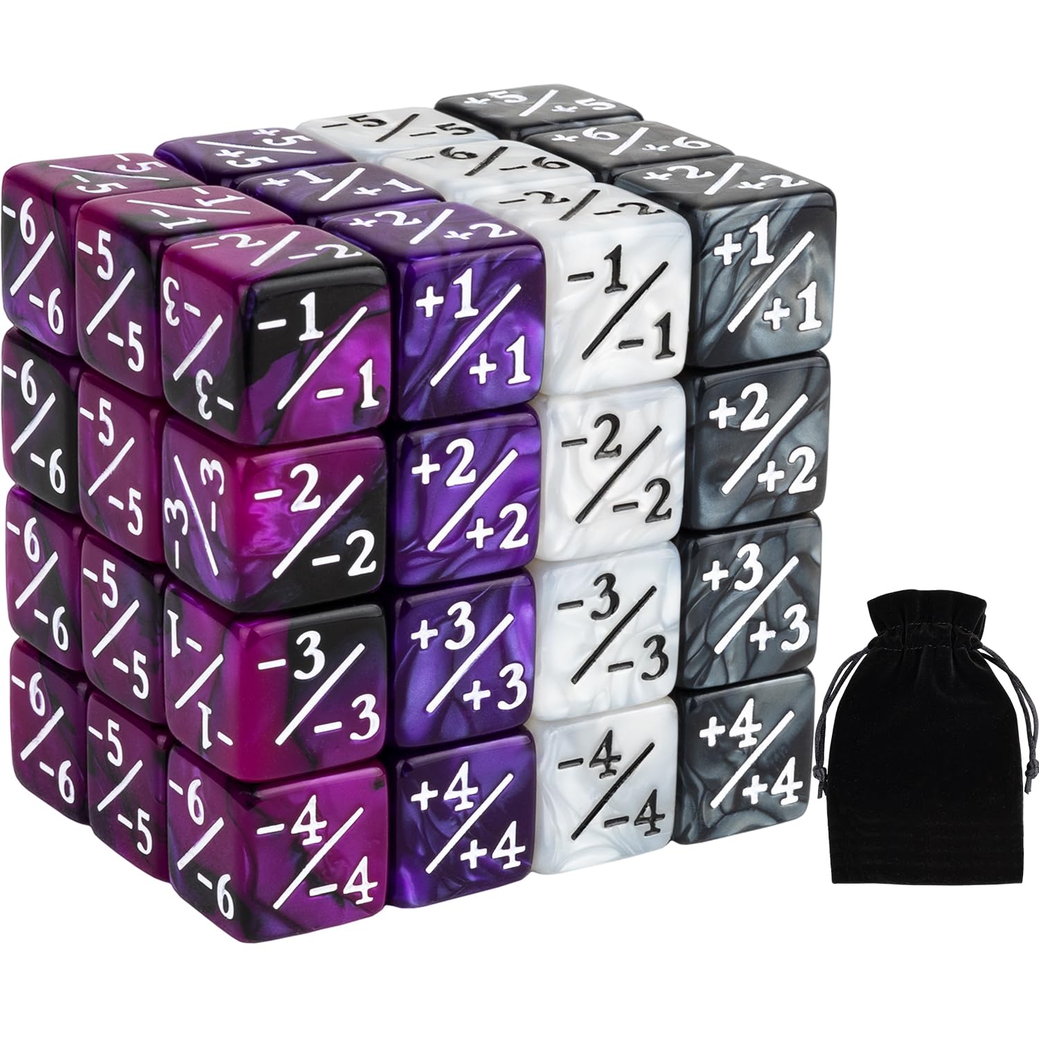 - Q: What does the package include with the Magic Counter Dice? A: The package includes a total of 48 Magic Counter Dice, featuring 12 pieces each of black marble positive dice counters, white marble negative dice counters, purple positive dice counters, and purple&black negative dice counters, along with a convenient black velvet bag for storage.