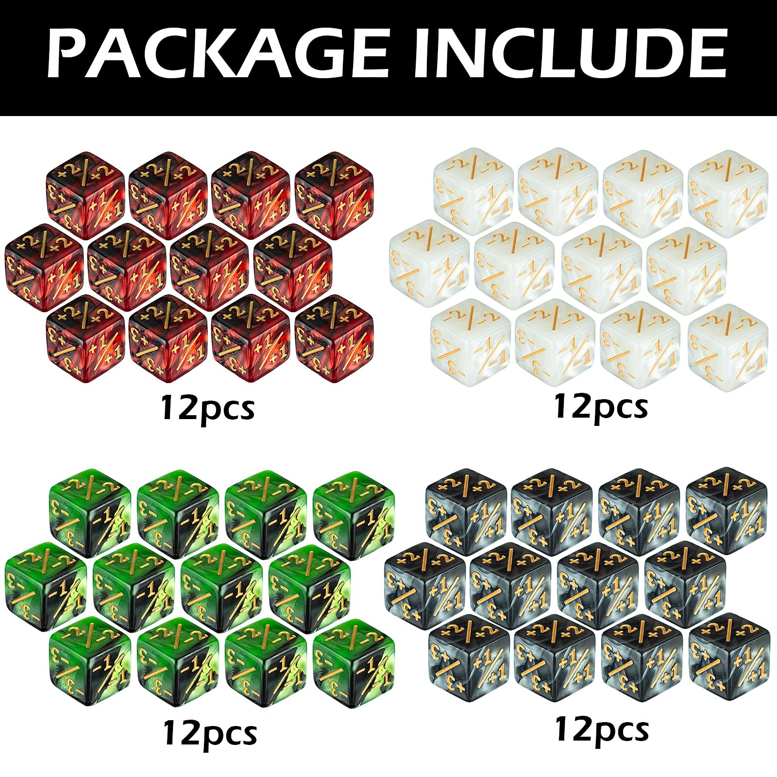 Why Do You Choose LAMJAM?LAMJAM is a brand which focused on Toys. Thank you for your trust in our brand. We guarantee that you will be 100% satisfied in our store with your good shopping experiences.Features: - Material: eco-friendly acrylic- Color: 4 different styles as shown in pictures- Contains: You will receive 48 pieces dice counters with 2 flannelette bags. Includes 24 pieces +1~+6 dice counters & 24 pieces -1~-6 dice counters - Compatible Game: Perfect compatible with MTG - Magic The Gathering some CCG and card games. Package Included: - 48 dice counters - 2 * flannel bags Customer Service: - If you have any problem of our product Could you please contact our customer team we are still standing by to assist you. Tips: - There might be a little color difference due to the monitor camera or other factors. Warm notice: -Small stuff please keep them away from children under 3 years old. mature-themed supervision is required. ADD YOUR CART ENJOY YOUR GAMING TIME!