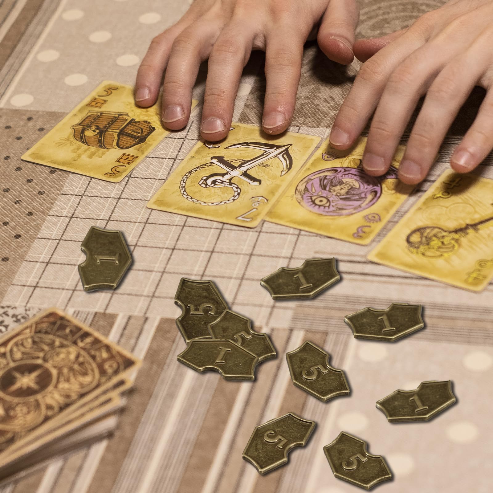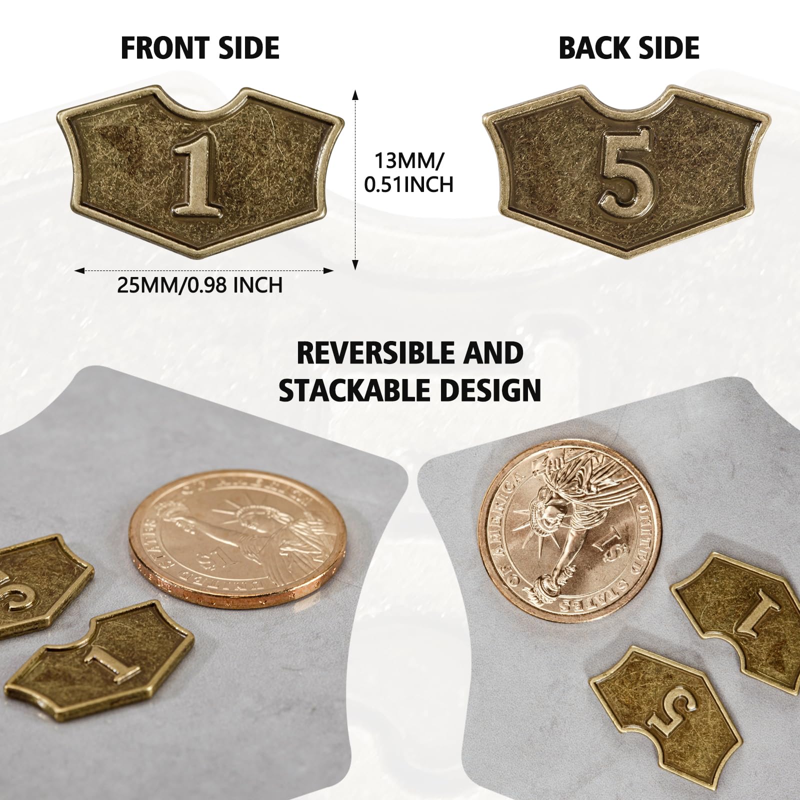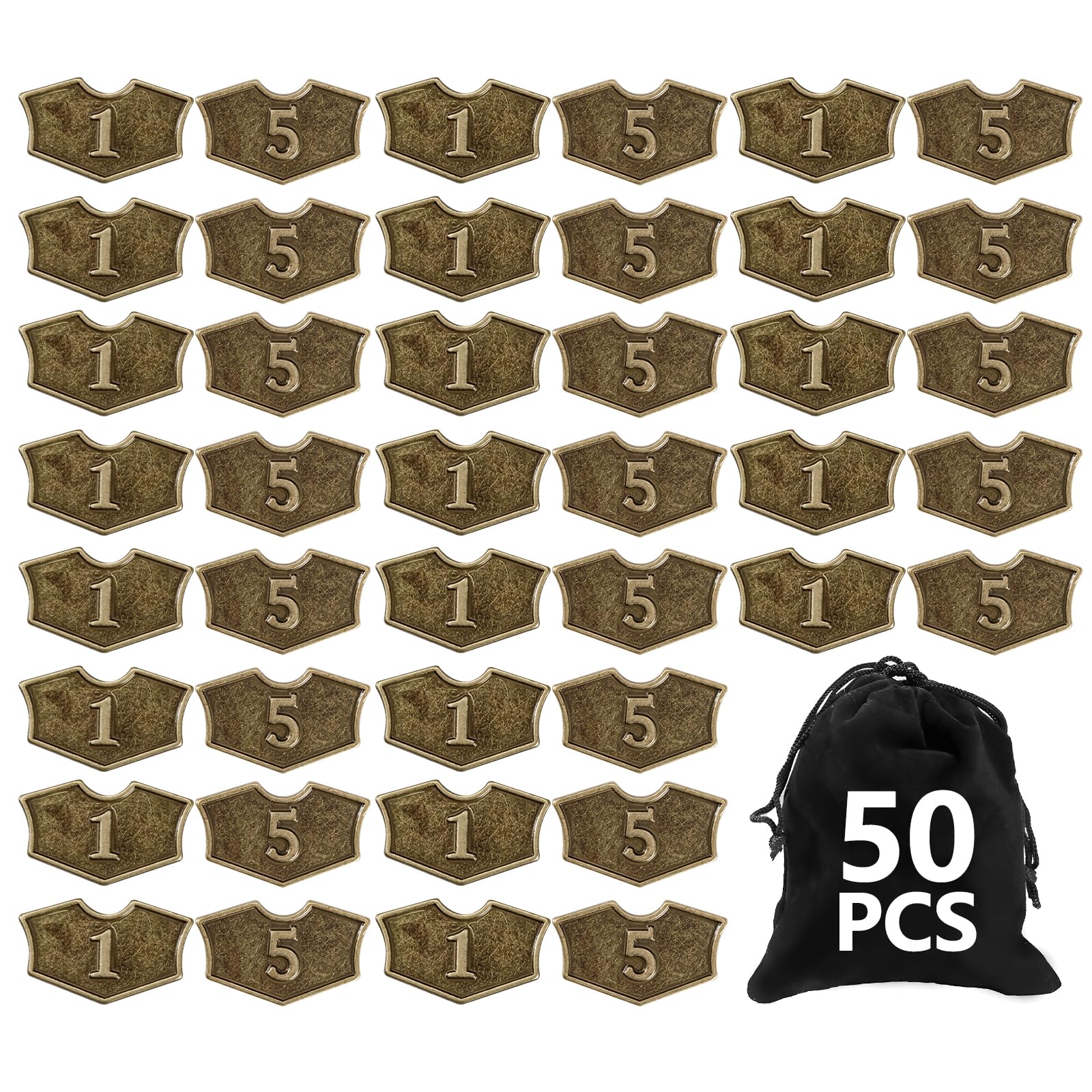 Adequate quantity: Comes with a set of 50 metal counters, which are easy to stack and show multiple 1 or 5 in an instant, Each measure approx.1 inch in width. enough to satisfy your game using and replacing needs Creative design: Metal counters are designed with reversible and stackable which makes it easy to stack multiple layers, practical enough, and will save you much space. These metal counters will surely turn heads at your next game. Specification: Main material: metal Color: antique gold Size: 1*0.57 Inch Package includes: 50 x metal counters 1 x Velvet drawstring pouch Note: Manual measurement, please allow slight errors on size. The colors may have slight differences due to different screens.