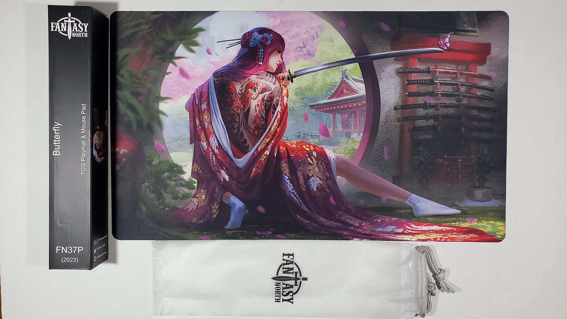 Fantasy North playmats are sized 24in x 14in x 1/16in and are composed of a smooth microfiber surface and a non-slip rubber base. Playmats are washable and due to their material composition, can also function as mouse pads. Each playmat features a unique high-resolution artwork, conceived by the brand and hand-crafted by a talented artist. Each playmat also comes packaged inside of a box that features the name and image of the playmat, serving as a means of protection and transport.