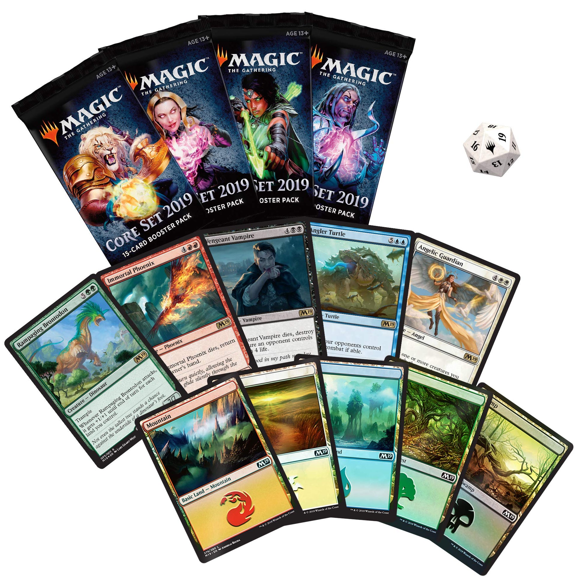 The Magic Gift Pack is a collection of Magic: The Gathering cards and accessories bundled together into the perfect gift for birthdays, the holidays, or any other occasion. Inside are four booster packs with fifteen Magic cards each, plus five foil land cards, a die for keeping track of life totals, and five rare foil creature cards, printed for the first time in the Magic Gift Pack.