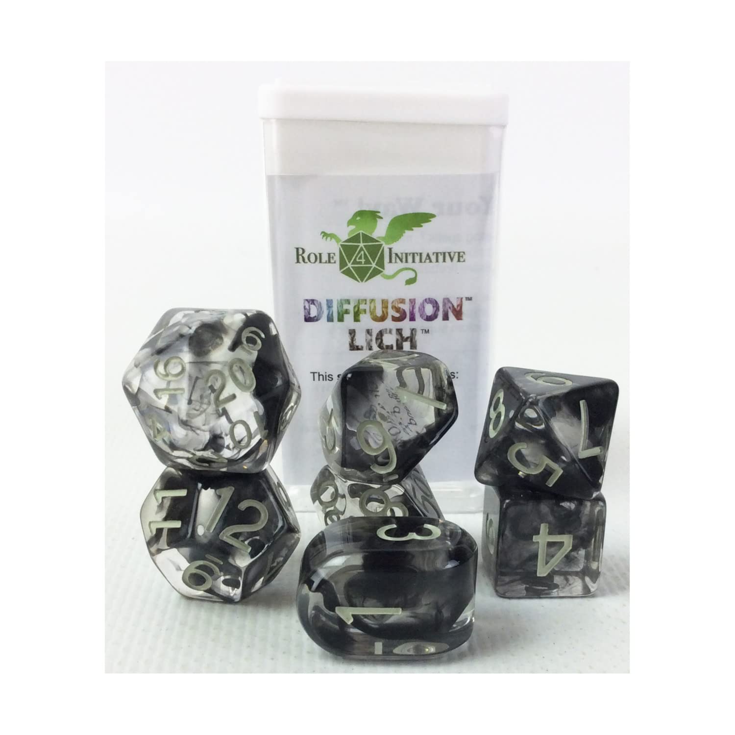 Set of 7 Dice: Diffusion Lich w/ Arch'd4Each set of R4I dice averages about 25% larger in size than traditional dice for higher visibility and better rollability!Contains Arch'd4 d6 d8 d10 d% d12 Balance'd20 in a plastic display box.