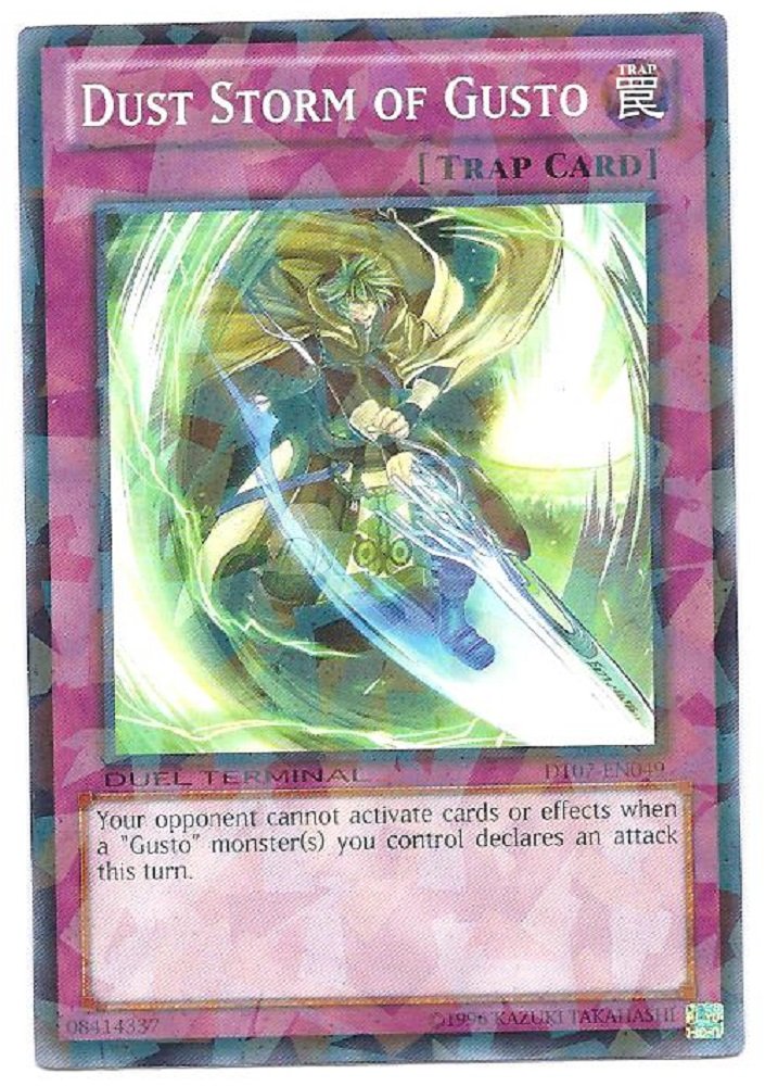 Yu-Gi-Oh! Is A Strategic Trading Card Game In Which Two Players Duel Each Other Using A Variety Of Monster, Spell, And Trap Cards To Defeat Their Opponent 'S Monsters And Be The First To Drop The Other 'S Life Points To 0.Card Name: Dust Storm Of Gustocard Type: Normal Trapcard Number: Dt07-En049Set: Duel Terminal 7Attribute: Trappasscode: 8414337Card Text: Your Opponent Cannot Activate Cards Or Effects When A &Quot;Gusto&Quot; Monster(S) You Control Declares An Attack This Turn.