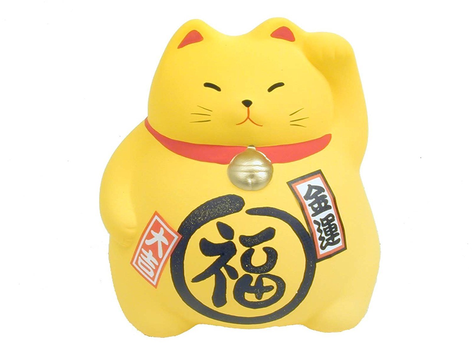 Japanese ceramic Maneki Neko lucky cat coin bank. Dimension: 3.5 inch x 3.25 inch. Made in Japan. Brand new in gift box. Yellow Maneki Neko associated with wealth.
