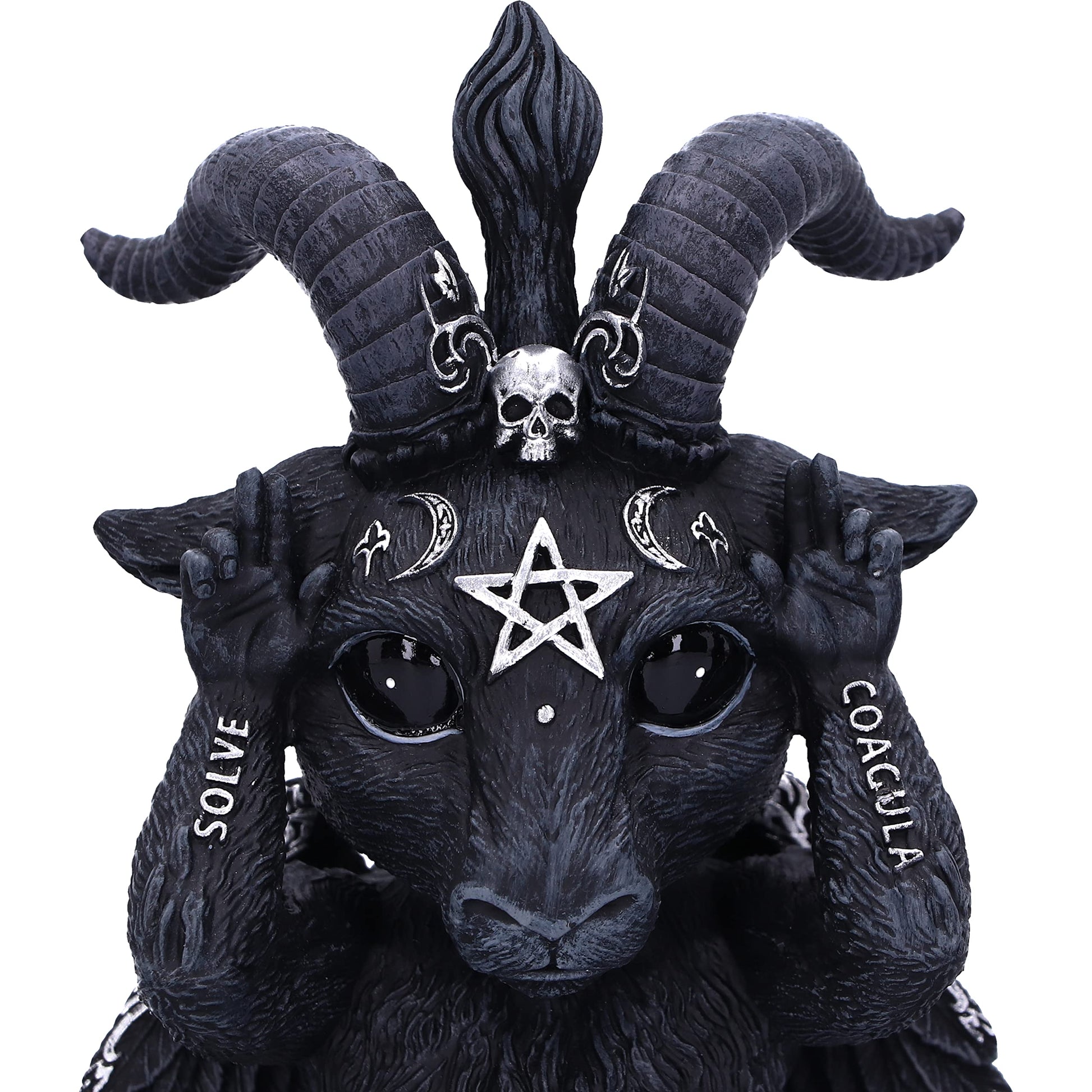 Available exclusively at Nemesis Now are these Three Wise Baphoboo figures. Sitting side by side, one covering their mouth, one their eyes and one their ears, these goat-headed hermaphrodites bare the Latin words SOLVE and COAGULA. Worshipped by occultists from Jacques de Molay’s Templars to Alistair Crowley, Baphomet has long been a symbol of free-thinking heresy and forbidden knowledge. Cast in high-quality resin before being expertly hand-painted these Three Wise Baphomet are perfect for any spiritual lover.