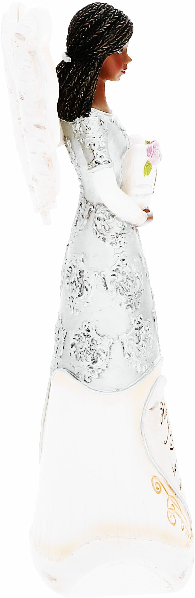 - Q: What materials are used in the construction of this angel figurine? A: The angel figurine is made from premium-quality resin and features hand-painted details, along with handcrafted birchwood styling that includes intricate embossed and debossed patterns.