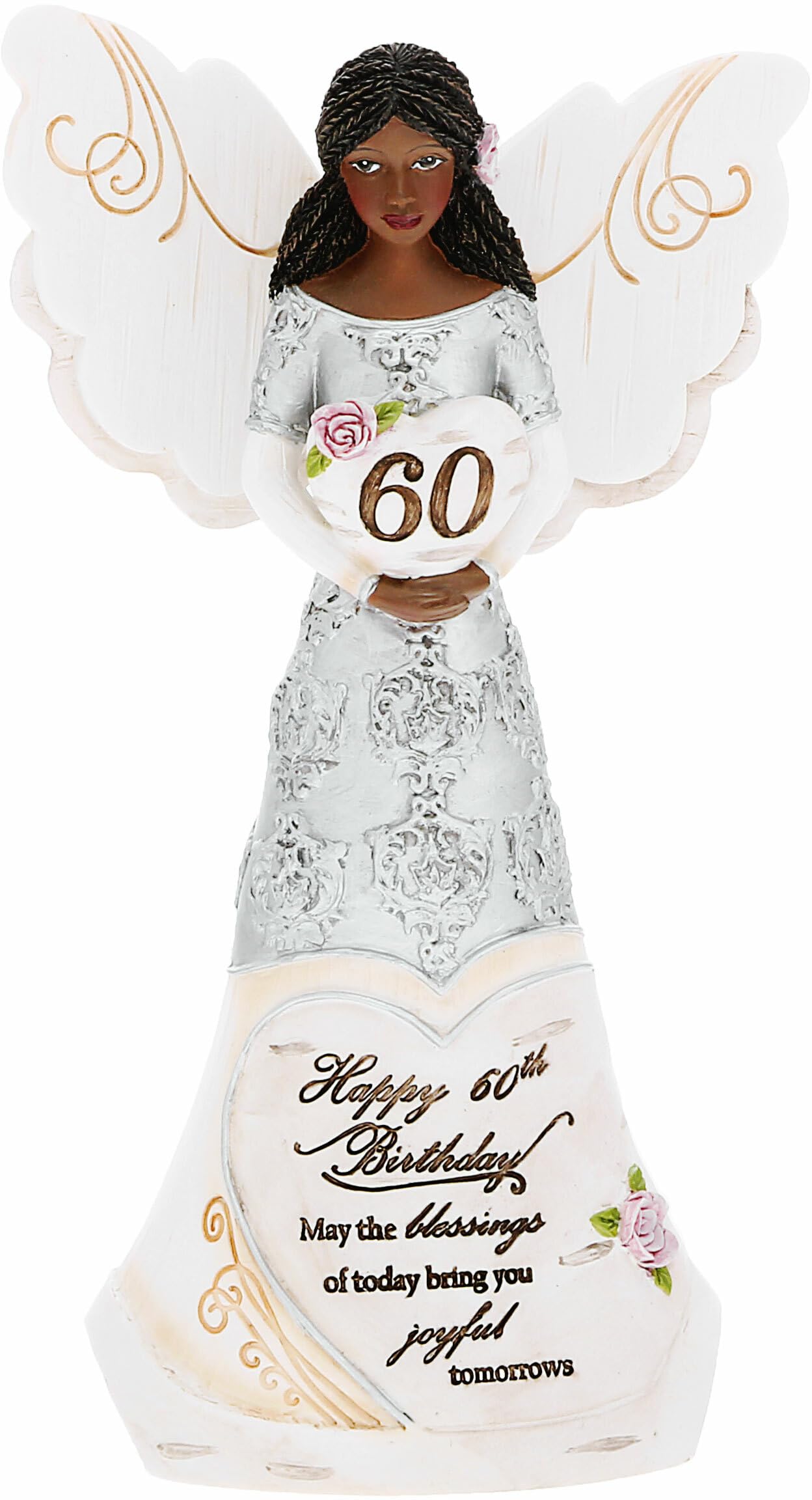 This Premium-Quality 6' Tall Angel Figurine Is A Beautifully Crafted Piece Made From Resin, Featuring Exquisite Hand-Painted Details And Handcrafted Birchwood Styling With Intricate Embossed And Debossed Patterns On Her Wings. With A Neutral Silver And Cream Weathered Finish, It Seamlessly Complements Both Rustic And Modern Decor Styles, And Its Foam Feet Protect Surfaces From Scratching. The Figurine Bears The Sentiment 'Happy 60Th Birthday May Today'S Wishes Fill Your Life With Happiness,' Carved In Cursive On The Center Of Her Dress'S Bottom Half, Enclosed Within A Heart And Accompanied By Pink Roses. She Holds A Heart Above Her Chest, Bearing The Number '60.' Her Mid-Length Hair Neatly Rests On Her Shoulders And Back, And Silver Damask-Styled Details Add An Elegant Touch. This Angel Figurine Serves As A Charming Piece Of Religious House Decor, Making It An Ideal Gift For Friends Who Hold Their Faith Dear And Celebrate Christ In Their Homes. It'S Also A Unique And Heartfelt Milestone Birthday Gift Suitable For All Zodiac Signs And Birth Months, Ensuring It Can Be Cherished By Anyone Celebrating Their 60Th Birthday. Care Instructions Are Simple: Dust With A Dry Cloth. The Figurine Comes Securely Packaged Inside Tapped-Shut Foam, Complete With A Beautiful Gift Box That Can Be Easily Adorned With A Bow For A Hassle-Free And Stylish Wrapping Experience. Explore Our Storefront To Discover A Wide Selection Of Religious Angel Figurines And Statuettes Suitable For Various Occasions, As Well As An Extensive Range Of Birthday Gifts, Ensuring You Can Find The Perfect Present For Everyone On Your List.