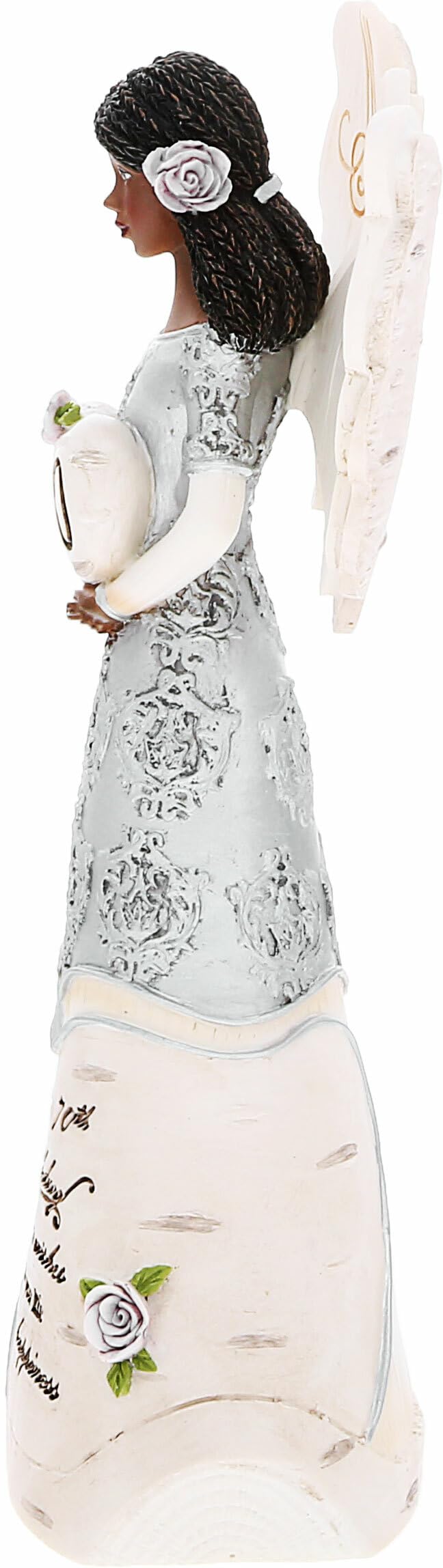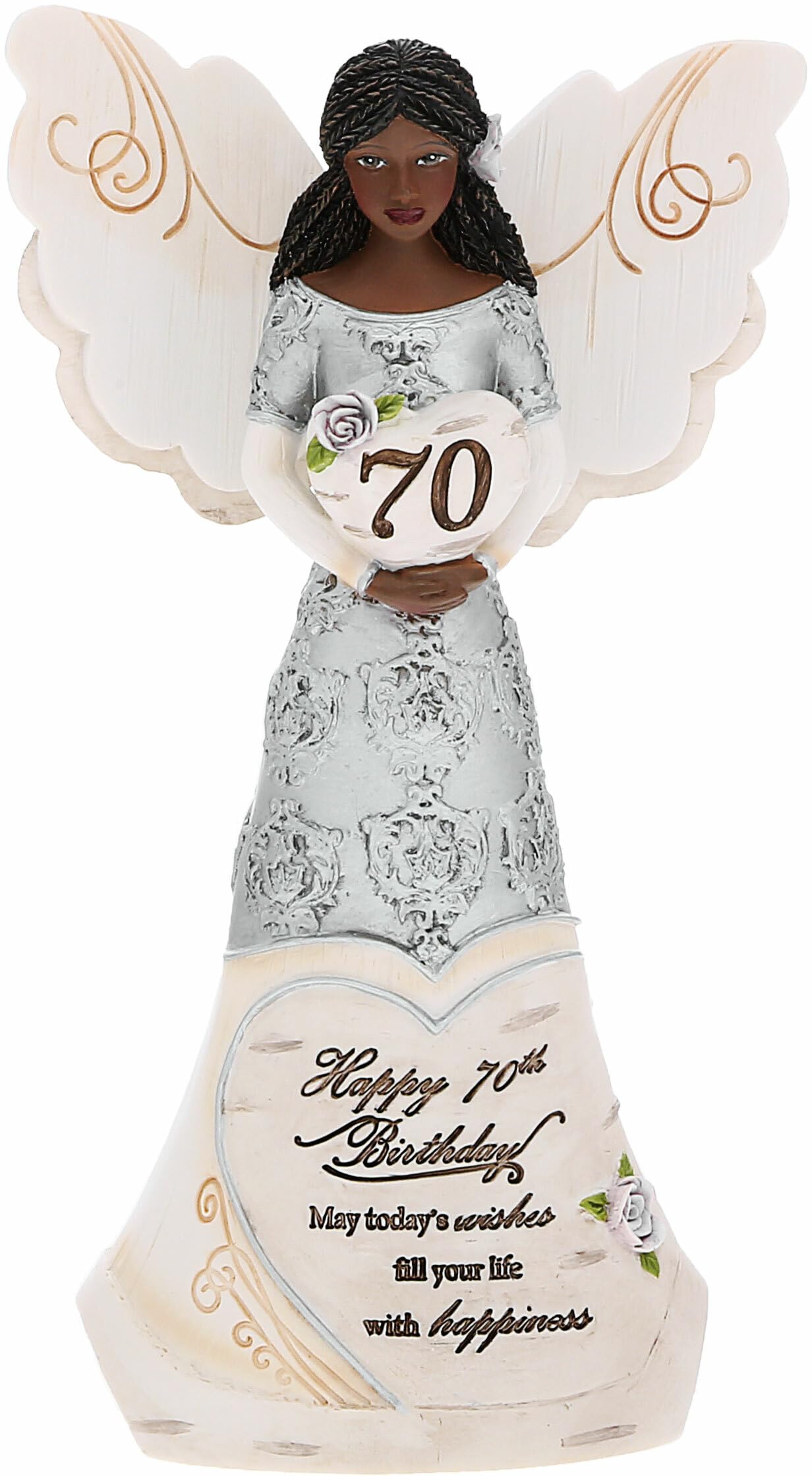 This Premium-Quality 6' Tall Angel Figurine Is A Stunning Piece Crafted From Resin, Featuring Meticulous Hand-Painted Details And Handcrafted Birchwood Styling With Intricate Embossed And Debossed Patterns On Her Wings. Her Wings Gracefully Flutter With Swirled Patterns At The Center Of Her Back, And She Boasts A Neutral Silver And Cream-Weathered Finish That Complements Both Rustic And Modern Decor Styles. The Figurine Stands On Foam Feet, Ensuring Surfaces Remain Scratch-Free. Carved In Cursive On The Center Of Her Dress'S Bottom Half, Within A Heart And Next To Purple Roses, Is The Sentiment 'Happy 70Th Birthday May Today'S Wishes Fill Your Life With Happiness.' She Holds A Heart Above Her Chest, Adorned With The Number '70.' Her Beautiful Mid-Length Hair Rests Neatly On Her Shoulders And Back, And The Silver Damask-Styled Silver Details Add An Elegant Touch. This Angel Figurine Serves As An Adorable Piece Of Religious House Decor, Making It A Wonderful Gift For Friends Who Hold Their Faith Dear And Celebrate Christ In Their Homes. It'S Also A Unique And Heartfelt Milestone Birthday Gift Suitable For All Zodiac Signs And Birth Months, Ensuring It Can Be Cherished By Anyone Celebrating Their 70Th Birthday. Care Instructions Are Simple: Dust With A Dry Cloth. The Figurine Comes Securely Packaged Inside Tapped-Shut Foam, Complete With A Beautiful Gift Box That Can Be Easily Adorned With A Bow For A Hassle-Free And Stylish Wrapping Experience. Explore Our Storefront To Discover A Wide Selection Of Religious Angel Figurines And Statuettes Suitable For Various Occasions, As Well As An Extensive Range Of Birthday Gifts, Ensuring You Can Find The Perfect Present For Everyone On Your List.