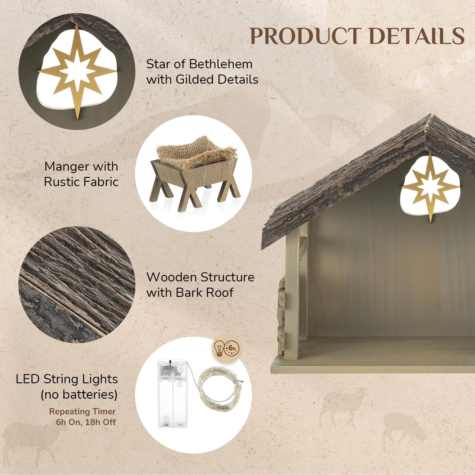 Storieme Nativity Stable with LED Lights: 15.6 x 11.02 Inch Christmas Wooden Manger Creche for 7 & 8 Inch Holy Family Figures - Farmhouse Religious Xmas Decorations (Stable Only)