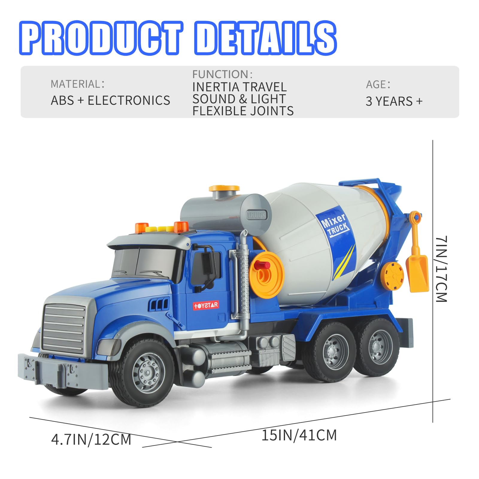 - Q: How large is the ANJARU Big Cement Mixer Truck? A: The dimensions of the cement mixer truck are 16 inches in length, 7 inches in width, and 4.5 inches in height, making it a large and visually impressive toy.