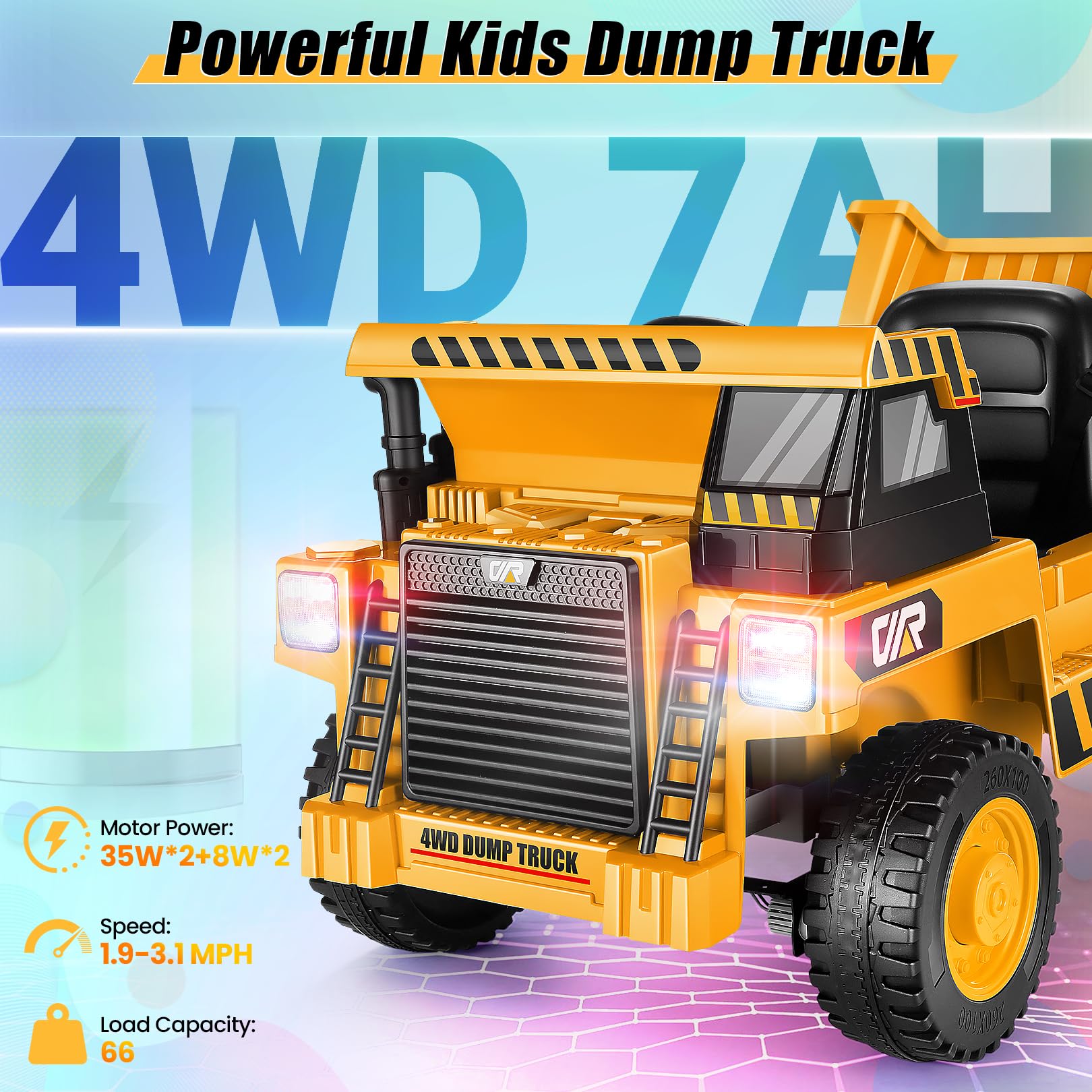 [About The Hikole 12V Dump Truck] The Hikole Ride On Dump Truck Comes With 12V 7Ah Battery And Four-Wheel Drive, An Electric Automatic Lifting Dump Bed, And An Extra Shovel For Added Fun. It Features Two Driving Modes, Spring Suspension, And Four Sturdy Wheels. With Exciting Features Like A Music Player And Horn, Let Your Kids Enjoy Realistic Riding Experience. [Why Choose The Hikole 12V Dump Truck?] 1. Excellent Performance: The Kids Ride On Truck Has Four-Wheel Drive And 12V 7Ah Rechargeable Battery. It Offers Longer Ride Times And Smoother Rides. 2. Safety And Reliability: With The 2.4G Remote Control, Parents Can Control The Dump Truck'S Direction And Speed, Ensuring Your Child'S Safety. Features Like Seat Belts, Soft Start, And Spring Suspension Provide A Secure And Smooth Driving Experience On Various Terrains. 3. Variety Of Entertainment: This Kids Electric Car Comes With An Electric Automatic Lifting Dump Bed And An Extra Shovel For Added Fun. It Also Offers Wireless Connectivity, Allowing Your Child To Play Their Favorite Music. It'S A Great Gift For Children Aged 4-8 Year Old. Specifications: - Battery: 12V 7Ah - Speed: 1.86-3.11 Mph - Weight Capacity: 66 Lbs - Recommended Age: 4-8 Year Old - Car Size: 46.9'L X 24.4' W X 22.1' H [Package Included] 1 X Charger 1 X 2.4G Remote Control 1 X Ride-On Dump Truck 1 X Manual Instructions