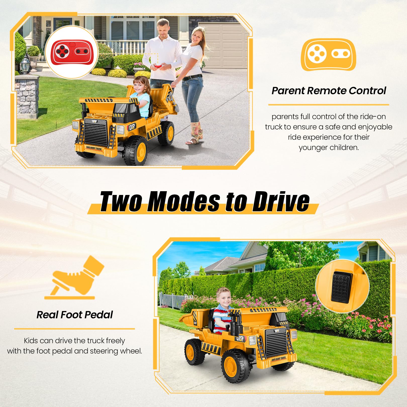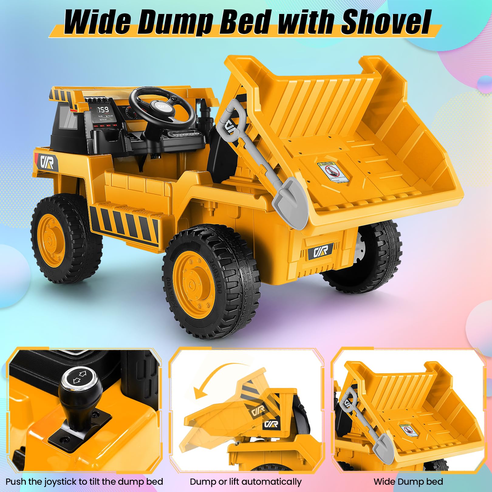 Hikole Ride On Dump Truck For Kids, Electric Cars With Remote Control, Dump Bed, Shovel, Bluetooth, Music Player, Ride On Construction Vehicles For Kids 4-8, Yellow