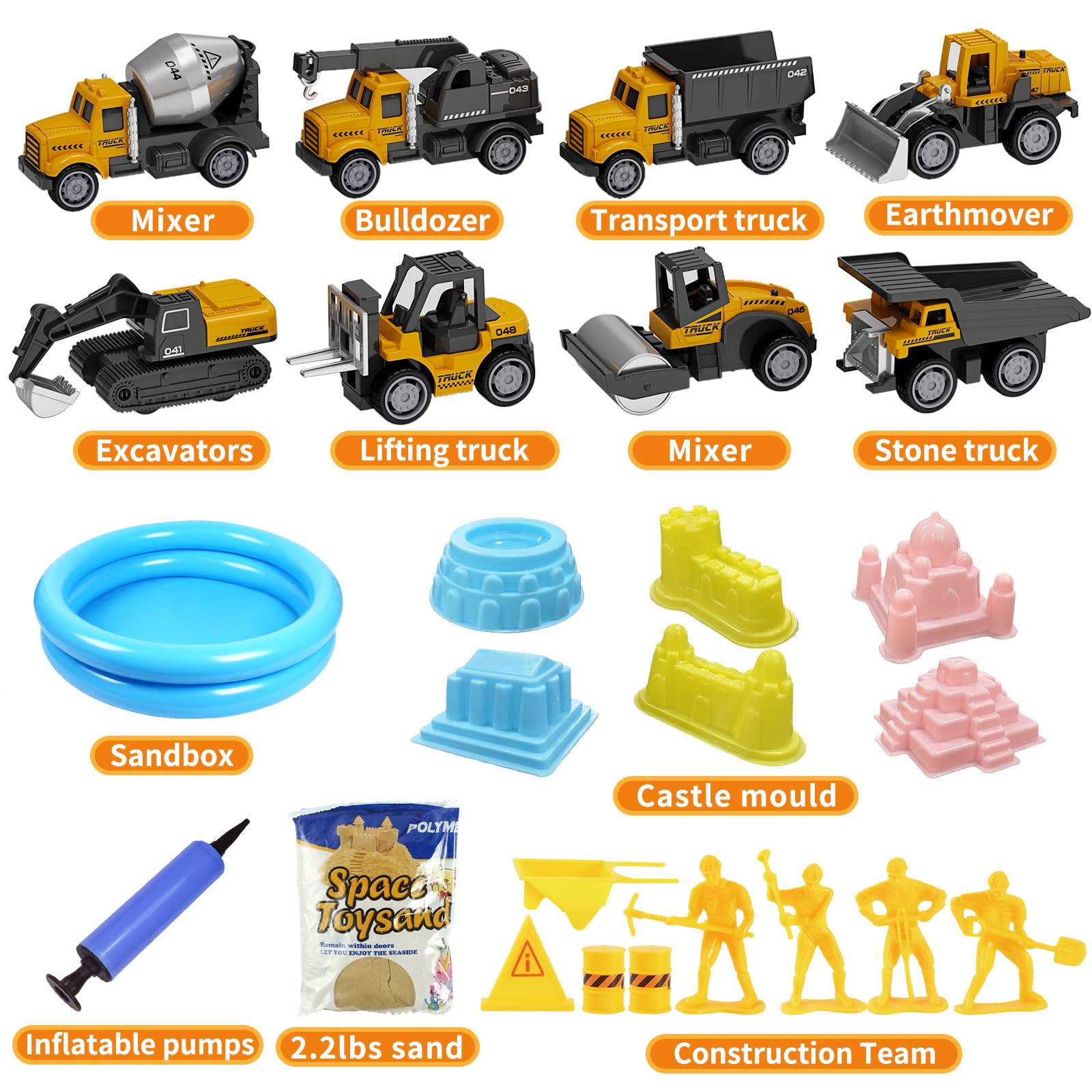 Play Construction Sand Kit,2.2lbs Magic Sand,8 Alloy Construction Vehicles,1 Inflatable Sandbox,8 Worker Figures and Road Signs,