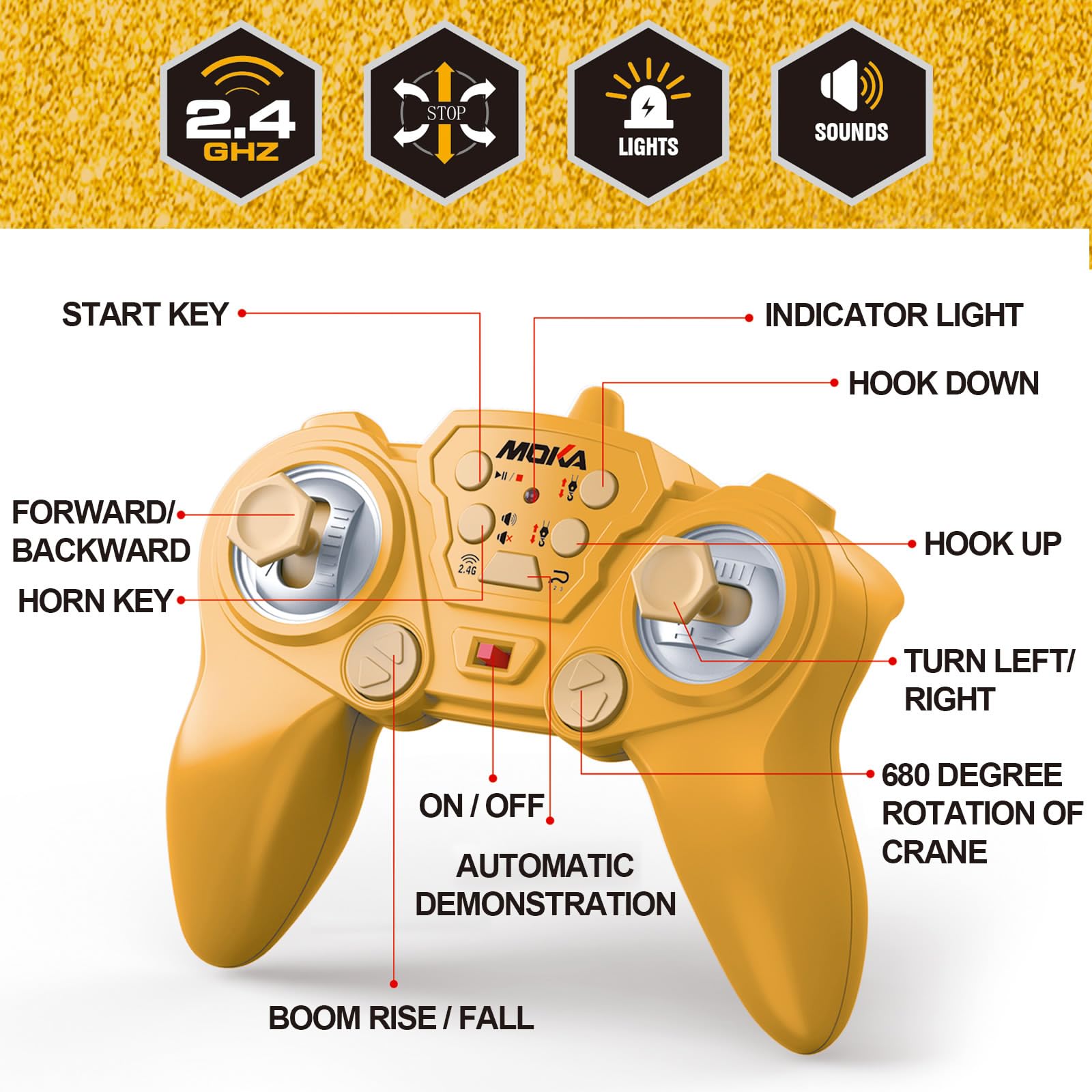 - Q: How does the remote control work with the WEMOKA Crane Truck? A: The crane truck features a 2.4GHz remote control system that allows for automatic pairing, enabling multiple players to operate their trucks simultaneously without interference.