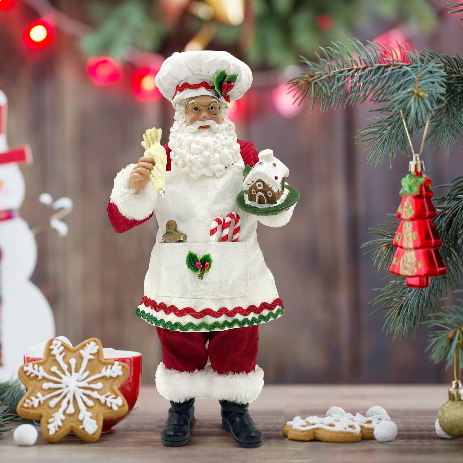 Looking for a little holiday baking inspiration. This intricately detailed Chef Santa wears a festive apron over his red suit and holds a decorating bag and an exquisitely decorated gingerbread house. Material: Cotton, Polyester, Resin . Size: 5 1/2''L x 4 1/4''W x 11''H.