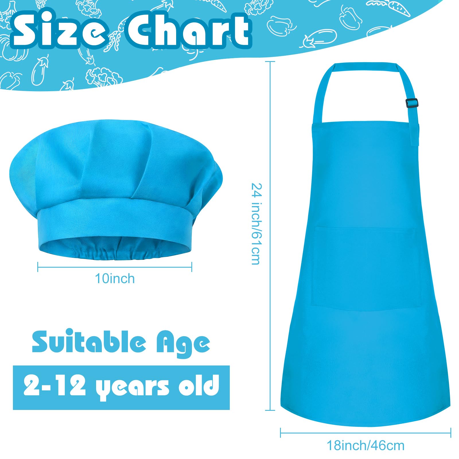Specifications: Material: Polyester Color: Blue Size: Kids aprons measure 24*18 inches with 2 pockets, chef hats measure 10 inches What you will get: Kids apron and chef hat set(3 set of Blue) Notes: Handmade, please allow slight size error Due to different screen displays, there may be slight differences in color