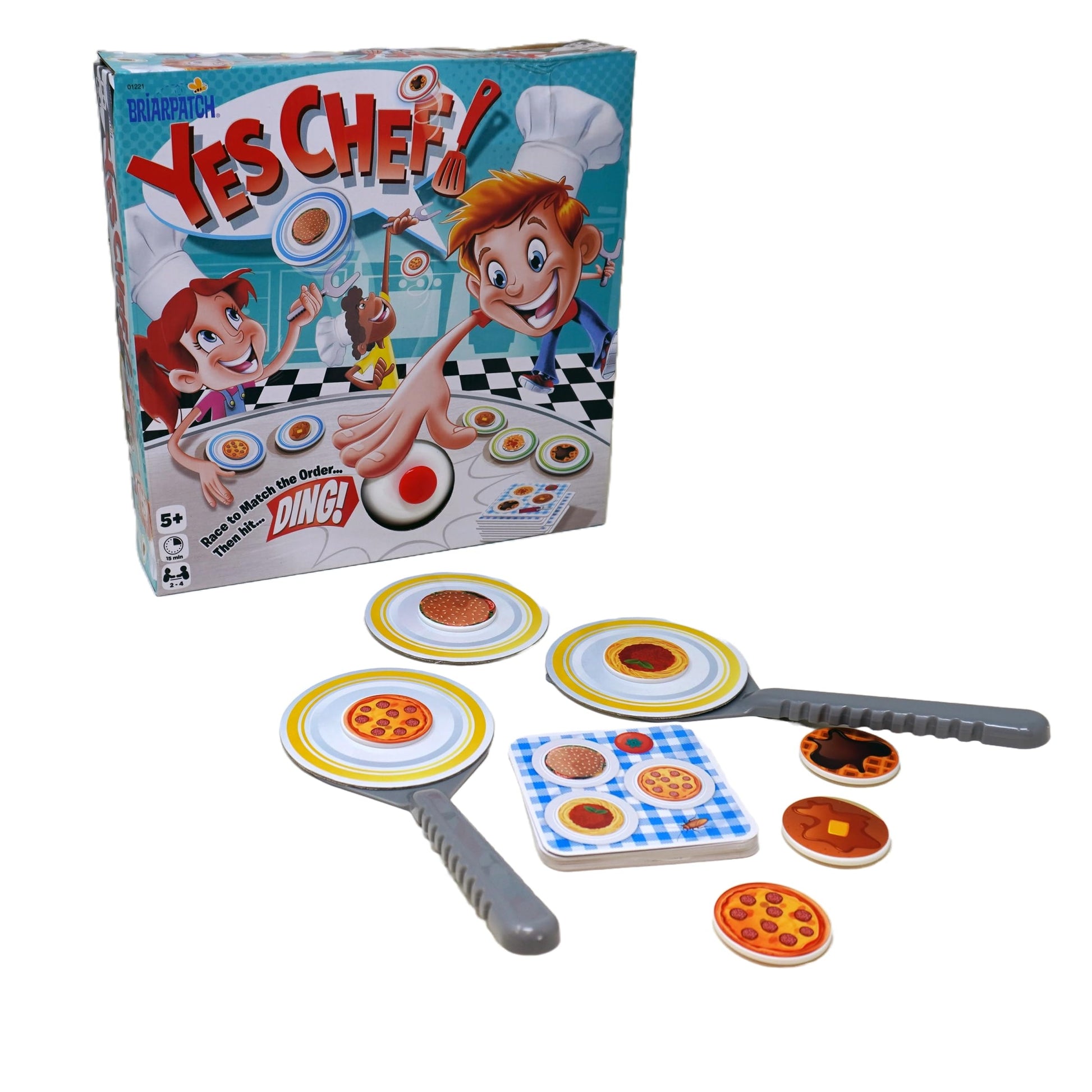 Yes, Chef! is a unique skill and action game where kids check the order card, use their spatulas to flip their plates to match the dishes shown, then race to be the first to ring the bell and fill the order. But if you see a cockroach, you must slap that order card instead to squash the bug. The chef who collects the most order cards wins in this fast-paced matching game!