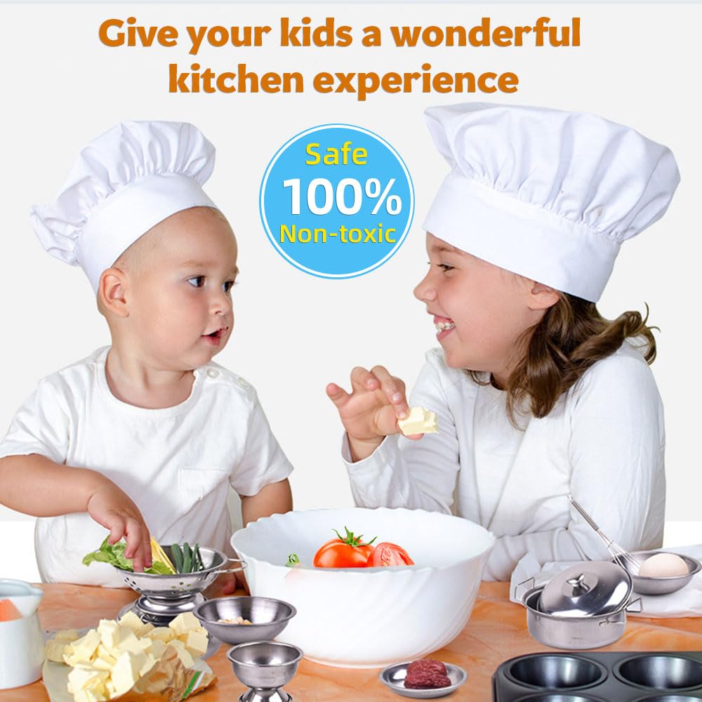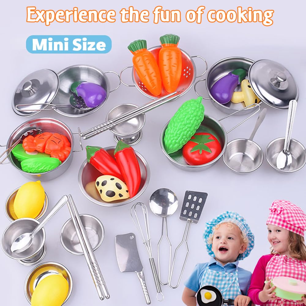 FIRST, QUALITY: Pots are made of durable and thick hand-polished stainless steel, handles and knobs feature sturdy riveted joints. Play food and accessories are made of non-toxic ABS plastic. All toy pieces are designed for secure and long-lasting play! 25 ITEMS REALISTIC KITCHEN PLAYSET: The KID-SIZED play set includes: stainless steel pots and pans w/ lid and handles, colander, pot rack; utensil holder contains 5 stainless steel cooking tools PLAY FOOD W/ STORAGE BASKET: giving a realistic chopping experience! A cute basket is added for storing and inspiring more ways of playing! EDUCATIONAL TOYS: A great learning tool for role play and to help increasing fine motor skills, life skills and social skills, minimize screen times and to enhance parent-child interaction. SUPER VALUE TOY : Ages 3+; Pot rack measures 12. 8'' H x 7'' W x 5. 7'' D (refer to Photo). A great addition to play kitchens and pretend play food-themed products. Generously sized toyset for birthday party, Christmas, New Year and more. FULL BUT NO MESS! FEEL LIKE REAL PROS! Especially sized for kids Pots can put neatly on a convenient rack after playtime, which forms a good habit of storage. Rich kitchen accessories from cutting, cooking, serving and storaging. Prefectly coordinates with any play kitchens, suitable for playhouse, outdoor kitchens, group play. Promotes self-confidence, social and cognitive skills, resilience and more.