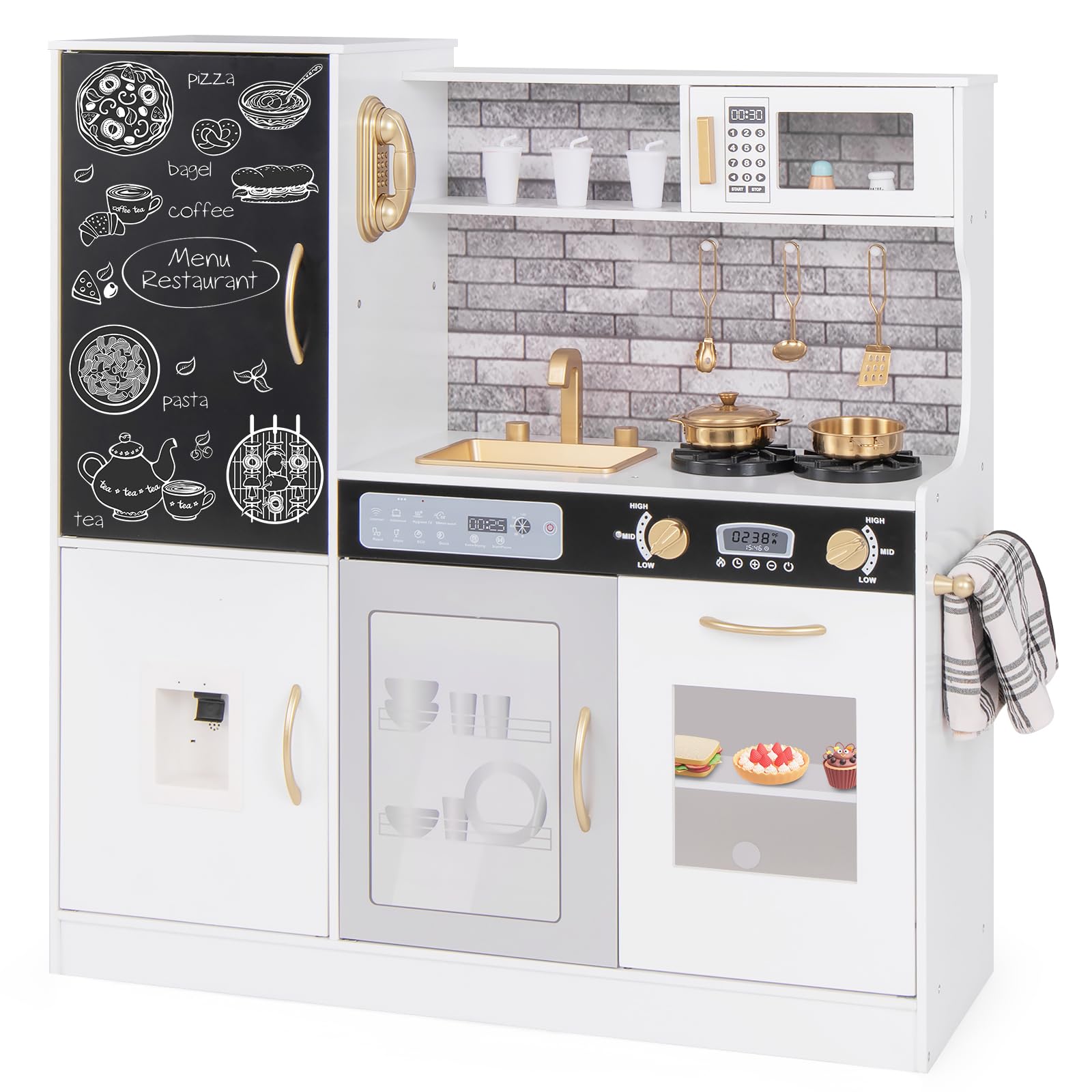 Costzon Play Kitchen For Kids, Wooden Toy Kitchen Set With Stoves, Microwave, Blackboard, Water Dispenser, Telephone, Cooking Ac