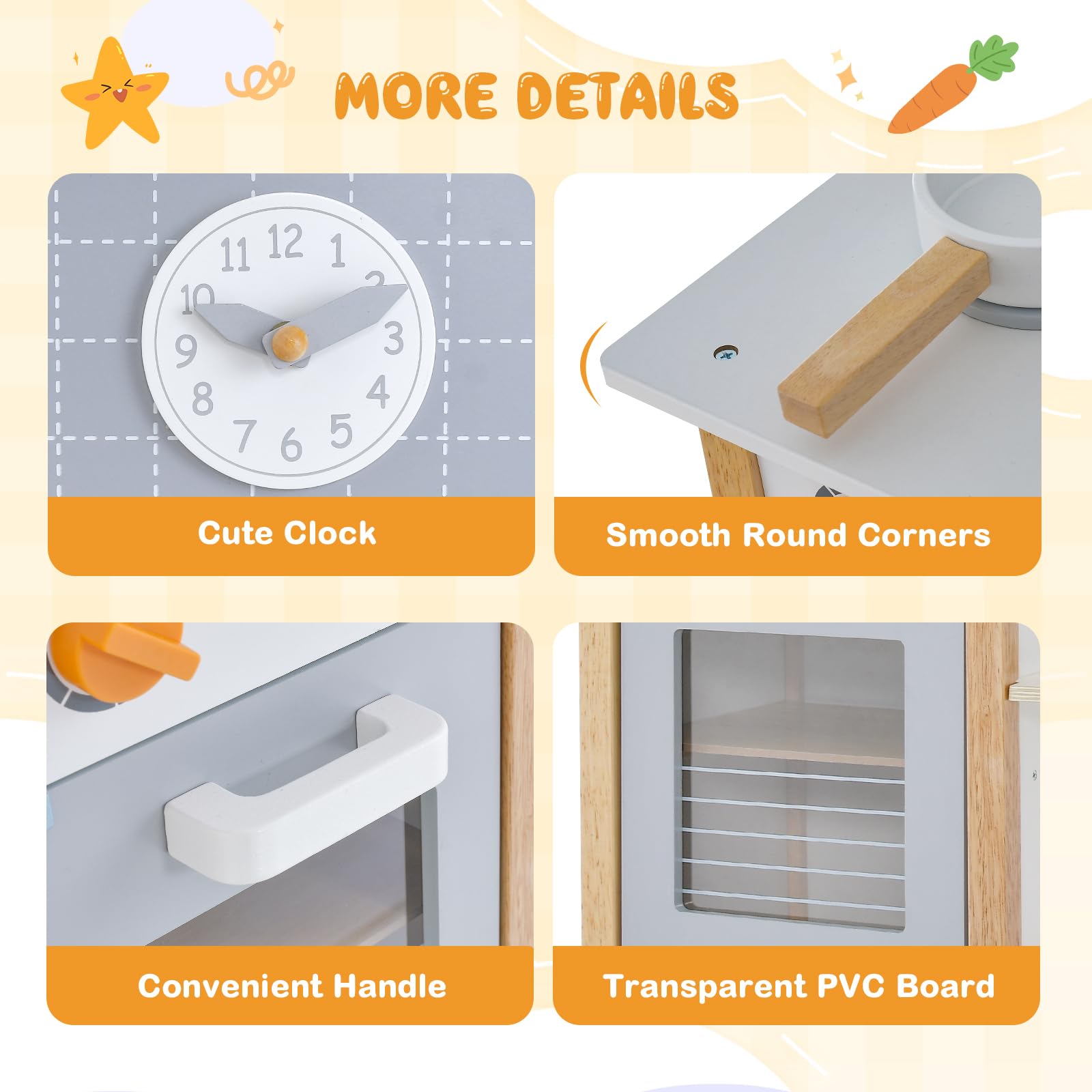 - Q: What features help with storage in this kitchen playset? A: This play kitchen includes a cabinet with doors and various shelves, providing ample storage space for toys and kitchen accessories. This helps keep the play area organized and encourages kids to develop their hands-on skills.