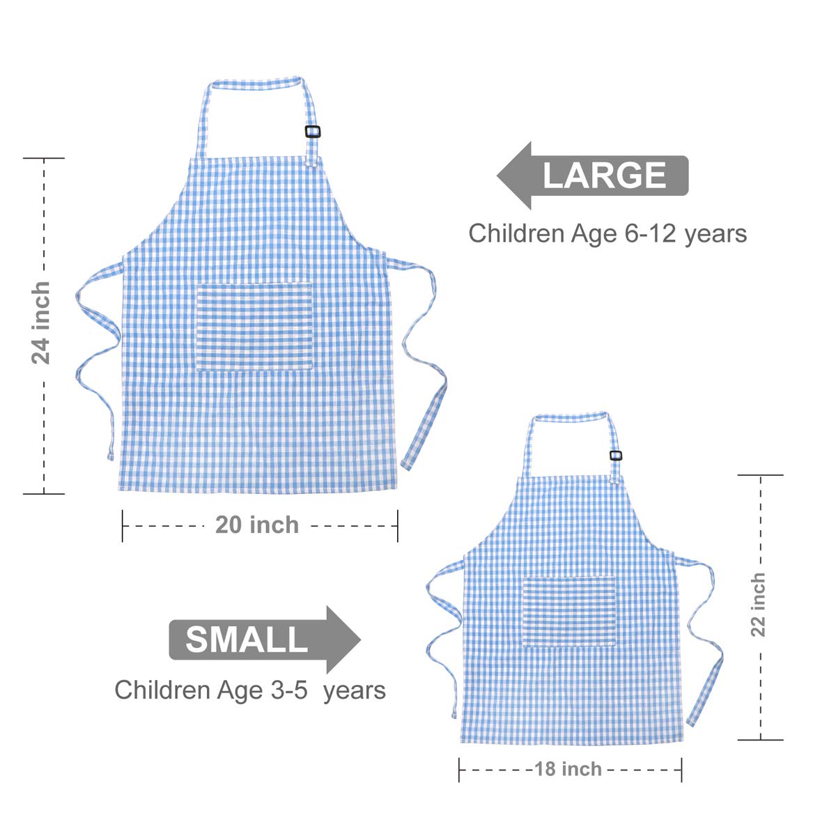 Super Jennice House kids apron set are made of 100% Cotton with bright colors and lovely patterns, designed to avoid getting painting, food or any other unwanted residue on your baby's clothing, suitable for any types of cooking birthday parties, painting parties, Christmas and New Year parties.Machine washable children aprons, durable easy to clean!Packing include: 1 Kids apron + 1 Matching chef hat 2 Sizes available:S-15 X 19'' (age 3-5 years)L-19 X 23'' (age 6-12 years)