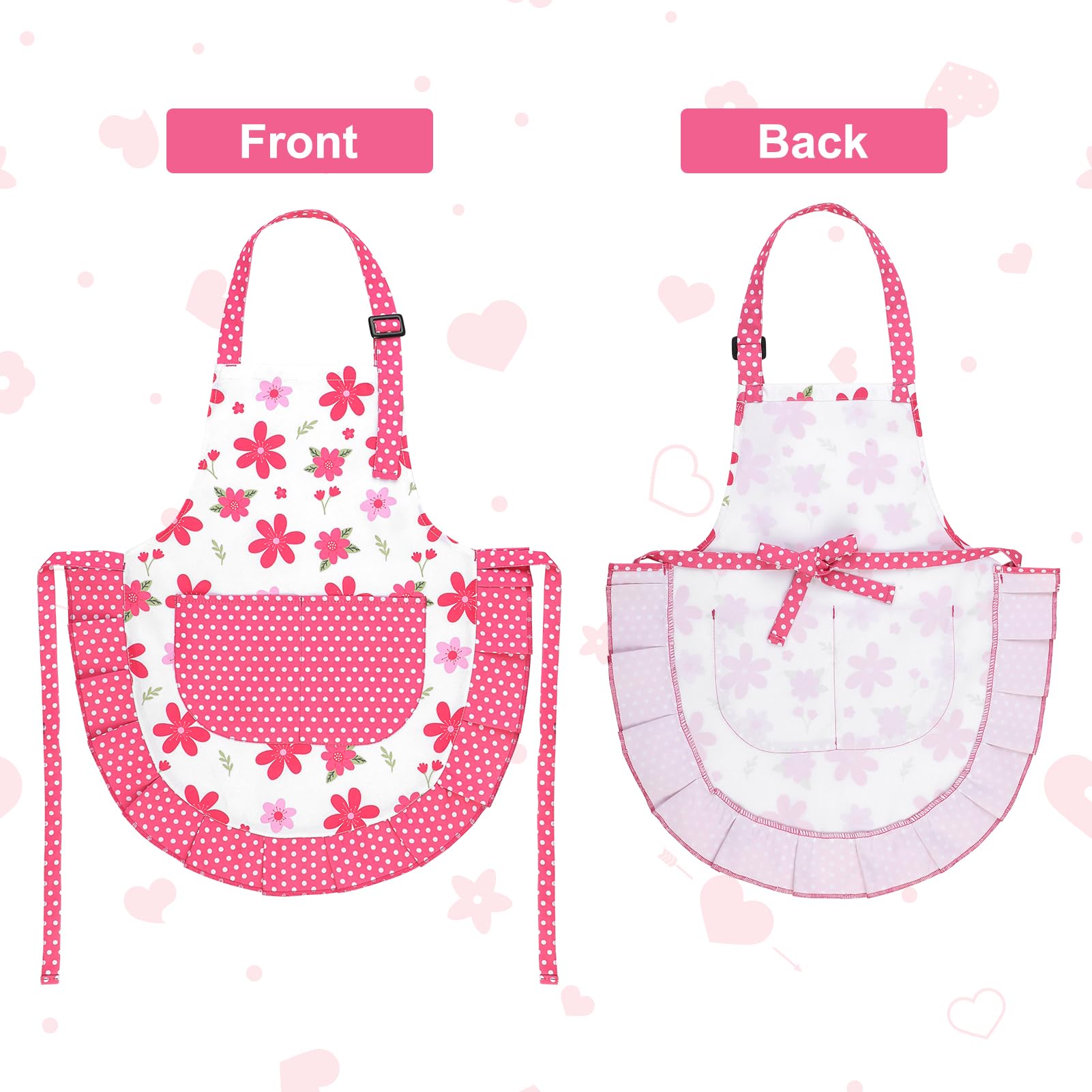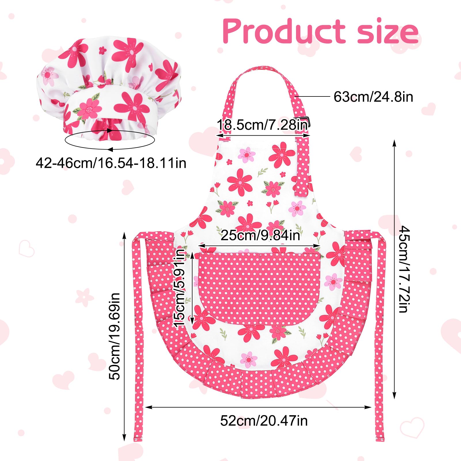 Features: Our kid apron with pink flower patterns, and retro ruffle side dot designs, is sweet and cute. This kid's baking apron is designed with adjustable neck straps, The Length of each back waist strap is 20.86 which is easy to wear. The cooking apron has two pockets that allow children to cook or paint while holding some little items. The polyester waterproof material apron is easy to clean and built to last, ensuring you can use it with confidence for a long time. The children's chef hat and apron combo is great for cooking lessons, baking, crafting, outdoors, gardening, painting workshops, art birthday celebrations, or DIY decorations. Specifications: Material: Polyester fabric (not waterproof) Style: Flower pattern Color: As the picture shows Size: Apron size: 45 x 52 cm / 17.72 x 20.47 in Waist ties: The unilateral strap length is 50 cm / 19.69 in Hat size: Head circumference: 42 cm - 46 cm adjustable Recommended age for apron: 3 - 6 years old Package Includes: 1 x kids Apron 1 x kids Chef Hat WARM NOTE! Please check the size before making your purchase. The size of cupcake aprons is 45 x 52 cm / 17.72 x 20.47 inches. The length of the single-sided back waist tie is 50 cm / 19.69 inches. Warm Tips: 1. Machine or hand wash. Hang to dry after washing 2. Please allow a 1-2cm error due to manual measurement. please make sure you do not mind before you bid. 3. Due to the difference between different monitors, the picture may not reflect the actual color of the item. Thank you!