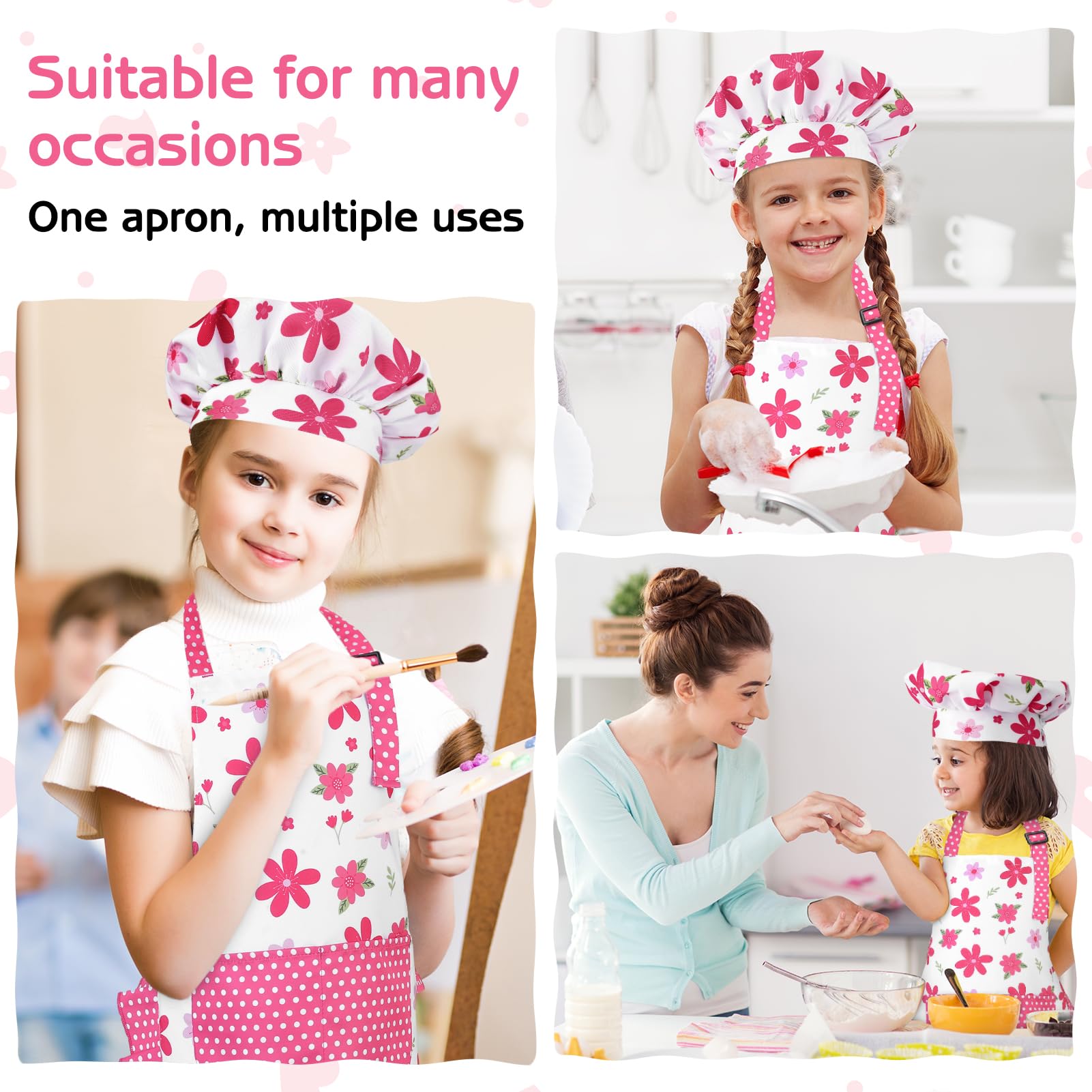 Kids Apron And Chef Hat Set, Cute Pink Flower Apron Adjustable Kids Aprons With 2 Pockets, Kids Cooking Aprons Artist Aprons Kit