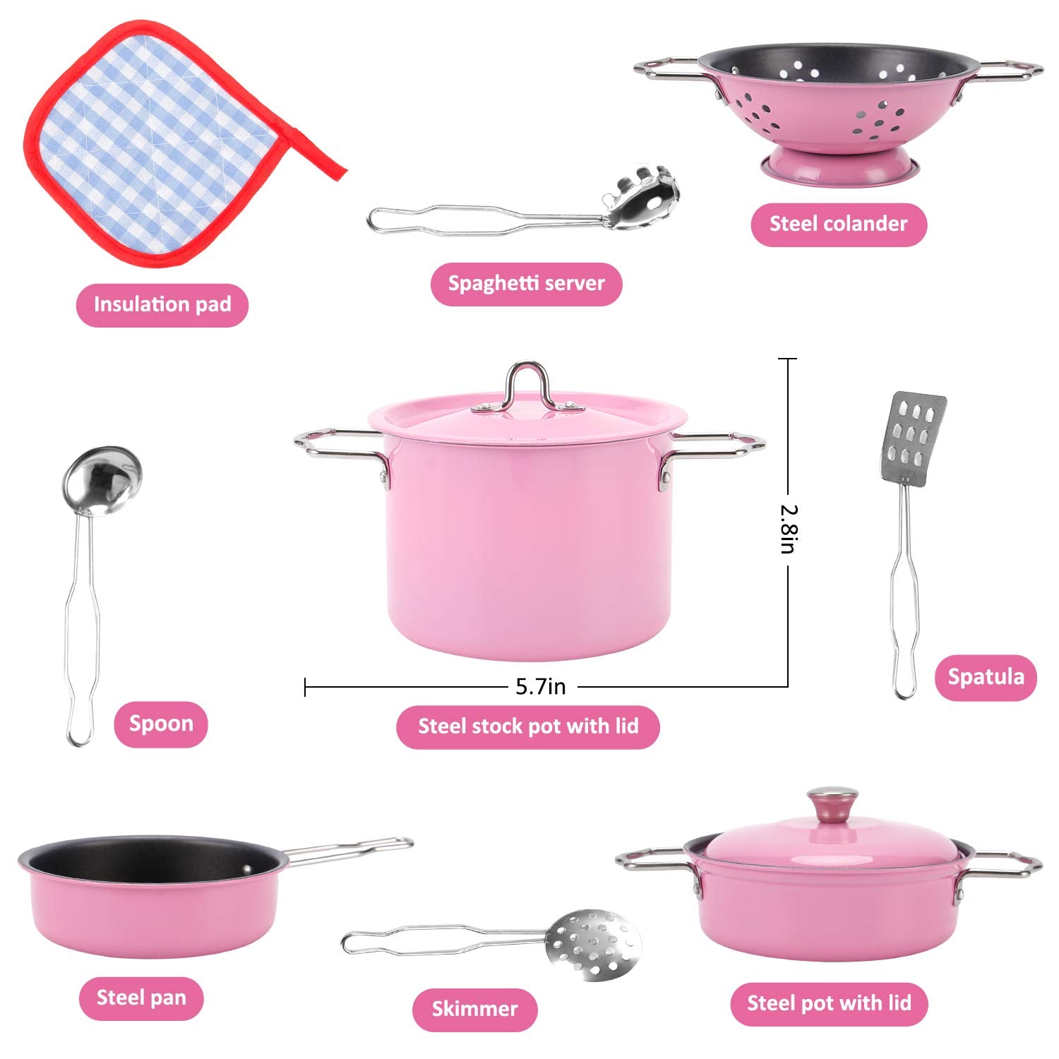 Kids Play Kitchen Toys Pretend Cooking Pink Stainless Steel Pots And Pans Metal Kitchen Set With Utensils (11 Pieces)