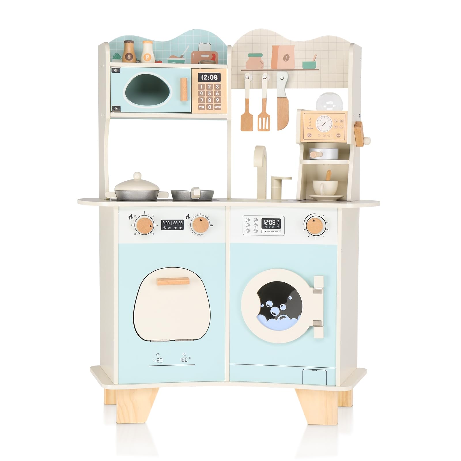 Ktaxon Wooden Play Kitchen with Coffee MakerThis wooden kids kitchen playset offers everything little cooks need for imaginative play! With a stove, coffee maker, oven, washing machine, cookware, and spices, its a complete mini kitchen designed for safe, realistic fun. This set encourages creativity, social skills, and hands-on learning!Specifications:1. Material: Wood2. Product size: 26.97''L x 11.61''W x 32.8''H6. Package size: 38.98''L x 14.96''W x 7.09''H7. Product weight: 20.94 lb8. Package weight: 26.46 lbPackage Includes:1 x Coffee Cup1 x Manual1 x Pan1 x Pot2 x Seasoning Bottles3 x Cooking Utensils4 x Coffee Wood Chips