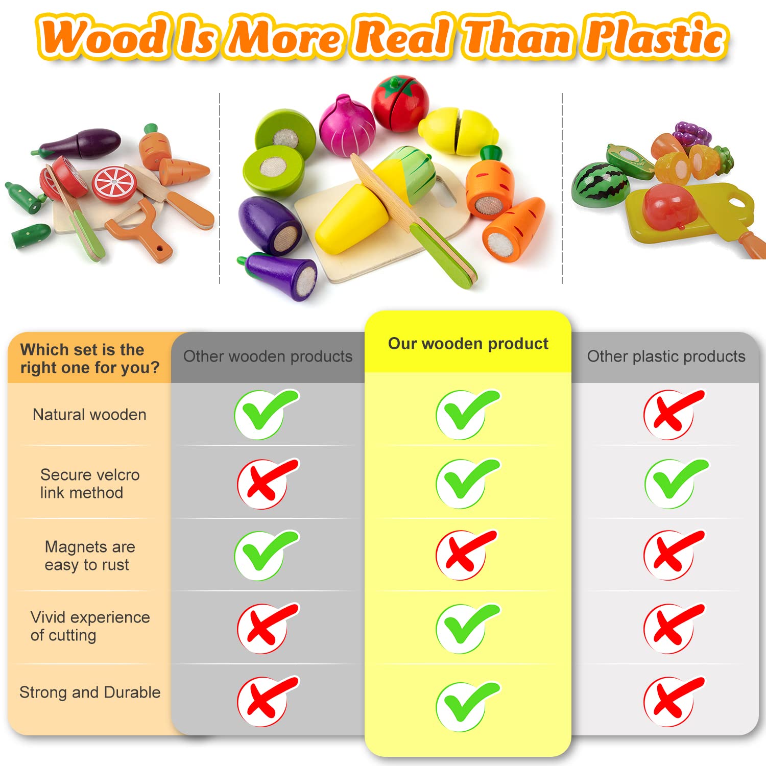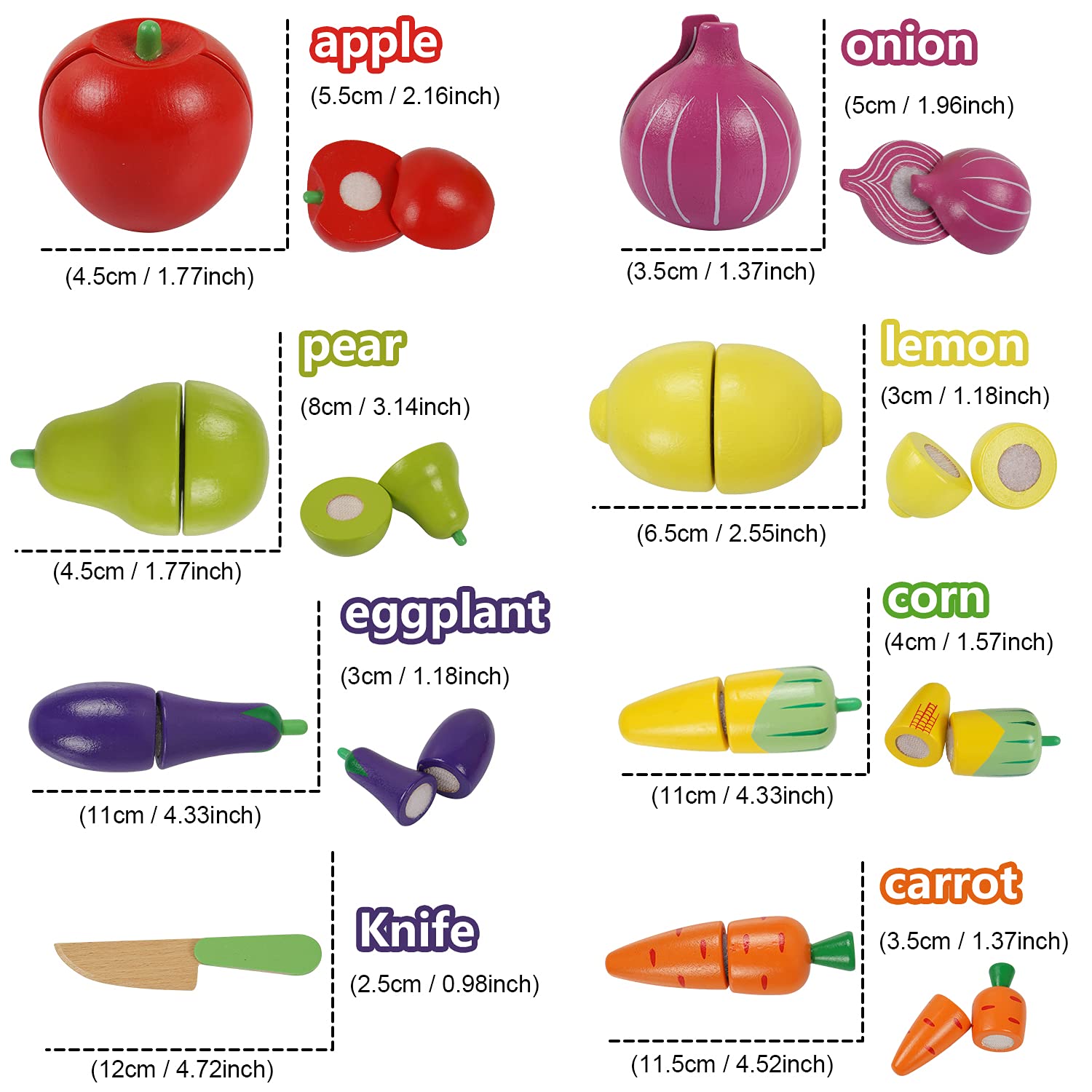 Play Kitchen Set: 23 pieces in total, including10 stainless steel pots and pans set, 1 wooden tableware, 7 wooden fruits and vegetables, 1 knife, 1 cutting board, 1 hat, 1 apron,1 storage bo Wooden vegetables and fruits are more textured and durable than those made of plastic, natural and healthy High-Quality and Safe: kids kitchen playset accessories utensils and vegetables are made of strong and high-quality materials pots and cookware are made of high-grade stainless steel, which has super durability and drop resistance, all play kitchen food is made from natural wood , non-toxic, odorless, and bright colors and the edges of all parts are smoothly rounded, toy kitchen which Is safe for children Interesting Educational Toys: kitchen toys for girls boys, children will gradually learn about various fruits, vegetables and tools Play Kitchen Accessories Set can be used as an educational toy for shape matching, counting and cognitive development concepts good motor skills, hand-eye coordination and grasping ability can be obtained by cutting, the perfect accessory for kitchen set for kids The Perfect Pretend game Food: kids play kitchen cooking sets inspire kids to take on the role of a chef, cook with their parents, learn some simple culinary skills, meeting the needs of the cooking baking for preschool little kids By learning different food categories, the names of tableware, you can play the role of a chef, learn how to use kitchen utensils, develop their cooking habits and imaginative game skills Perfect gift For Kids: Exquisite wooden toys are very suitable for kitchen set for kids for toddlers 3 years old the wooden food is spread out and glued together with nylon buckles, making a crunchy sound when the children cut the food toys, toddler kitchen playset which can bring the children a realistic feeling, toddler cooking set is the best gift for preschoolers and toddlers for birthdays, if you are not satisfied, please contact us