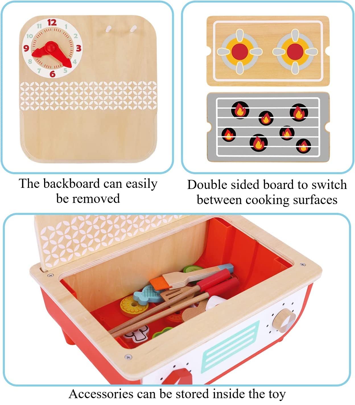 With this TOOKYLAND kitchen and grill playset, your little chef can have fun playing cooking while enjoying the benefits of pretend play! It brings an authentic role-playing experience to children. This cooking toy with a reversible top board has a two-in-one feature; one side features a cooktop and the other a barbecue grill. The clock can help the child learn to tell the time; clock hands and stove knobs click when turned, providing auditory feedback. The playset helps cultivate children's cognitive and sensory skills, improves their flexibility, social and practical skills and stimulates their imagination, all while having fun. The set's small size and the stove's internal design to fit the little parts are convenient for storage and help save space. This set includes the appliance, a backboard, a pan, a pot, 10 pretend food items and 8 accessories. This playset is made of wood and durable plastic with rounded edges and is painted with non-toxic water-based paint that is safe for children three years and older. Choking hazard: contains small parts, not suitable for children under three years old. Dimension: 11.81 x 7.87 x 11.81 in