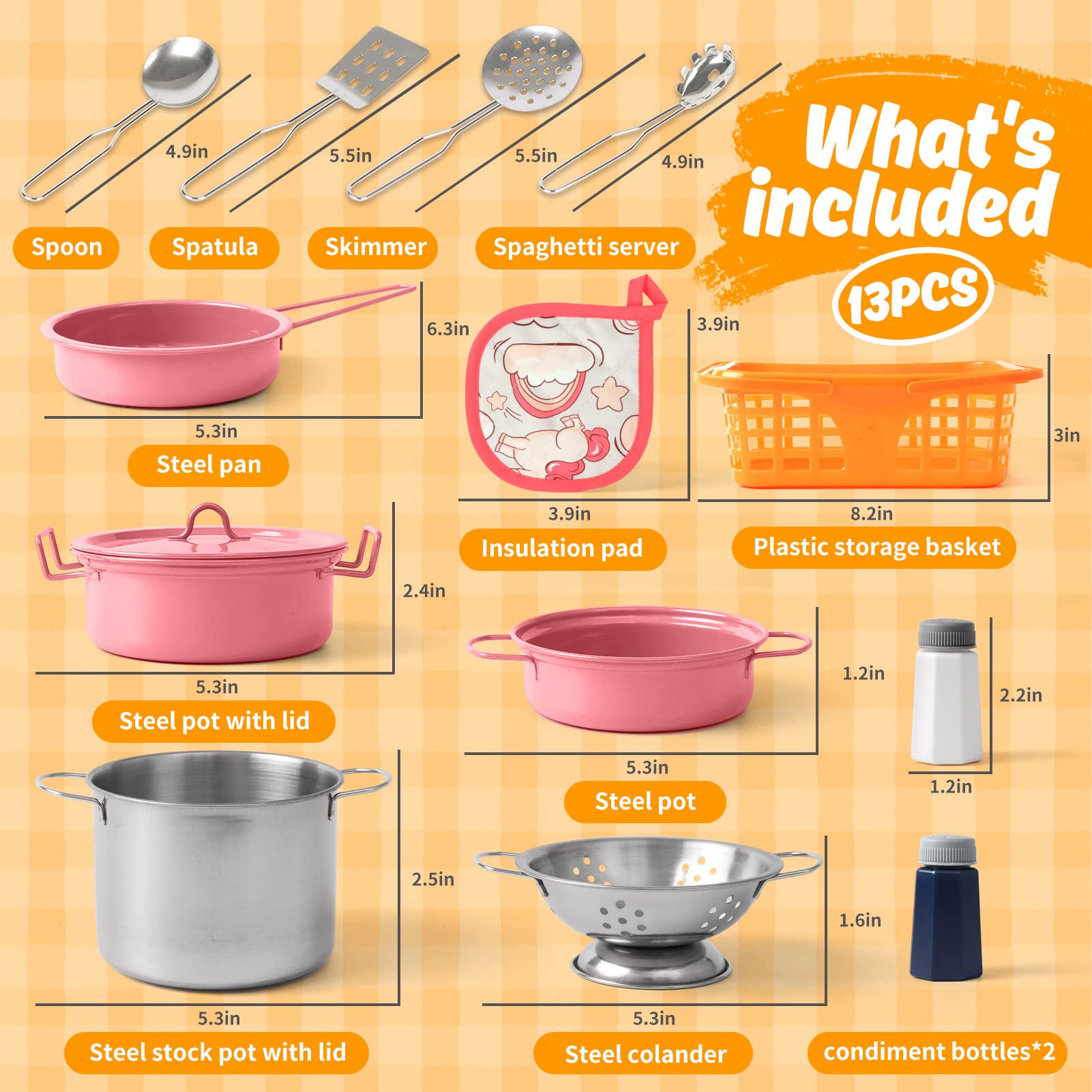 ??? Kids Play Kitchen Accessories ?- 14PCS set includes: One colander, one stockpot, one pan and one low pot, comes with one covers, one spatula, one ladle, one draining spoon, one spaghetti server, one table mat and 2 spice bottles. There is also a carrying basket to store all the kitchen utensils. ??? Teach Through Lively Activities ?- Role playing is one of children's favorite games. They like to pretend they are doing 'grown-up' things - It is a fun and important part of childhood development. Give children a chance of role plays as a chef and teach the knowledge of cooking. This cooking set for kids will give your children a novel experience of becoming a real little chef and stimulate their interest in cooking. ??? Sweet Family Time ?- Through interactive early learning, the kids cooking set helps you teach your kids how to cook and brings you some wonderful family time. It helps to accompany the growth of children and create more lasting sweet memories. ??? Safe And High Quality ?- Kitchenware is made of stainless steel. Comply with American toy safety standards and pass the safety testing of CPC, CPSIA and ASTM standards. Great for kids, toddlers and children. ??? Exquisite Gift ?- This is a perfect gift. Children like colorful colors, 6 colors can give children more choices. Children can also exchange kitchenware of different colors with each other, they like to share with good friends, suitable for many people to play together. Recommended as a birthday or holiday gift for children over 3 years old.