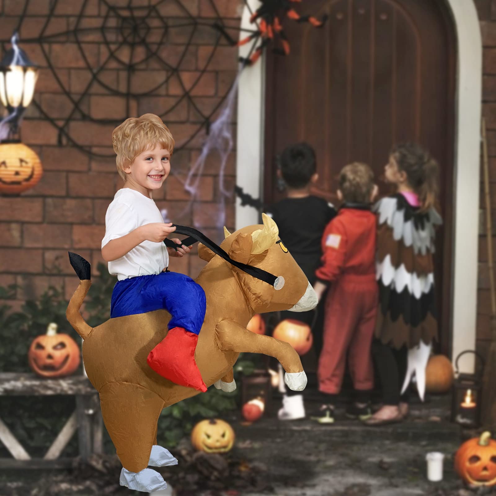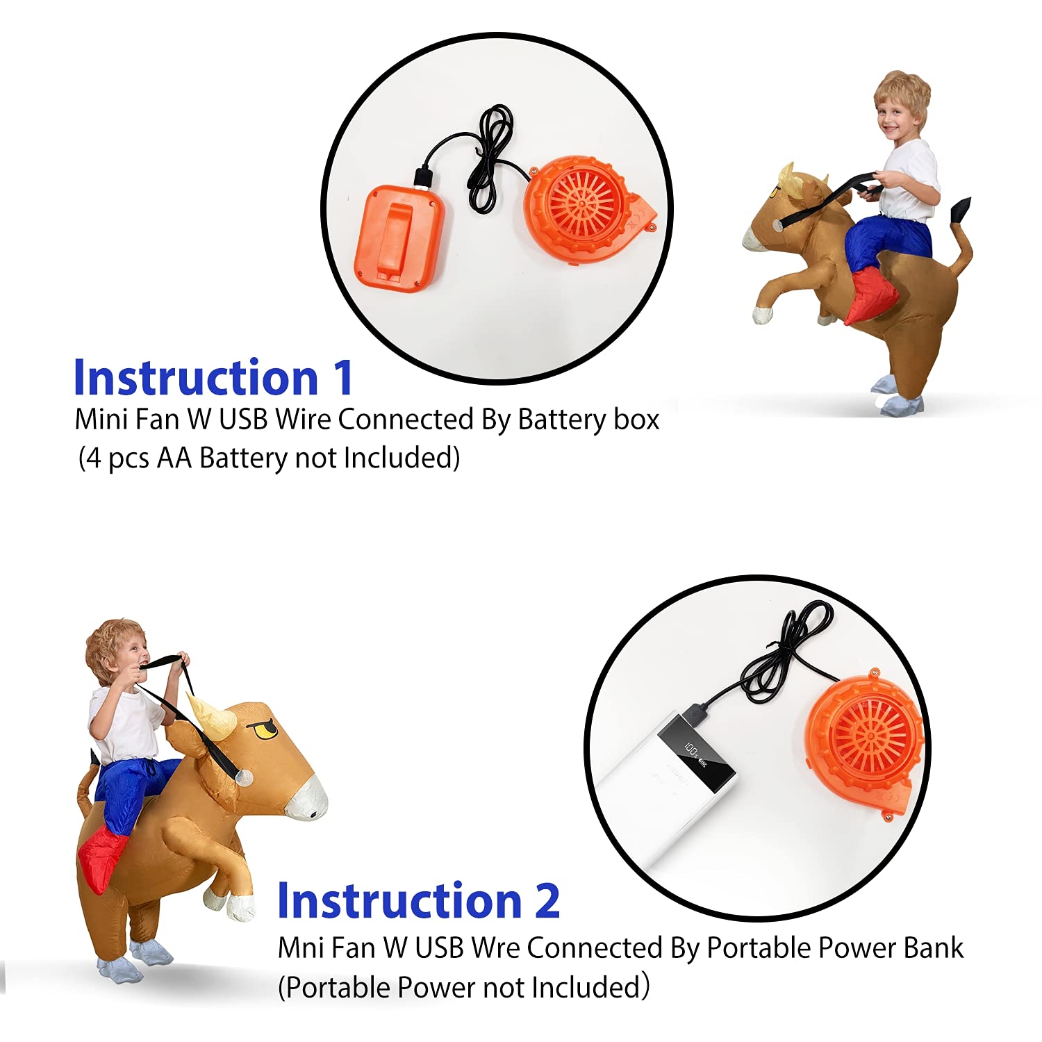Halloween Inflatable Bull Costumes: Halloween Inflatable bull rider costumes for toddlers. Made of polyester fiber. Suitable for toddlers 2.9-3.9 Feet(90-120cm). | Upgraded Dual Power Supply: Portable Power Bank or 4 AA batteries to operate the built-in fan. Fully inflate within 1 minute and stay that way all night long. Easy and convenient to use. | Quick to Inflate: Fully inflate within 1 minute. New 4 AA batteries can keep the inflatable costume inflated for about 4 hours. Before wearing, please tighten the outer ring to fix the fan, preventing it from falling loose during moving. | Material: The inflatable costume is made from polyester fiber material. Strong and durable, waterproof, no tear or holes. Easy and comfortable to wear. There are elastic bands on the neck, wrists and ankles to keep the costume inflated for a long time. | Halloween Costumes: Fun for Halloween party, cos play, Halloween Costume, Trick or Treat Events, festivals, birthday parties, carnivals, bars, parks, outdoor activities, etc.Please use the pocket located inside the costume to safely store the battery box, preventing burn your leg.