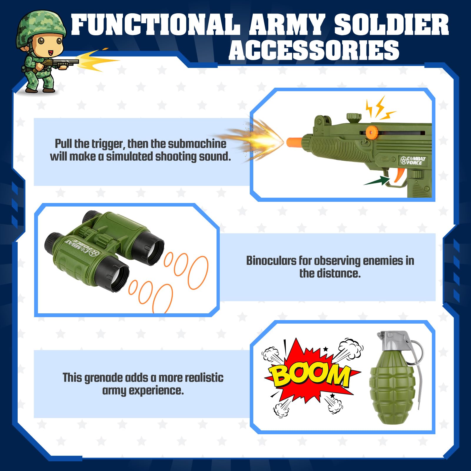 - Q: What is included in the GIFTINBOX Army Costume for Kids set? A: The GIFTINBOX Army Costume set includes a complete 4-piece soldier outfit featuring a top, pants, hat, and belt, along with accessories such as a plastic grenade, binoculars, walkie-talkie, plastic dagger, medals, and a whistle.
