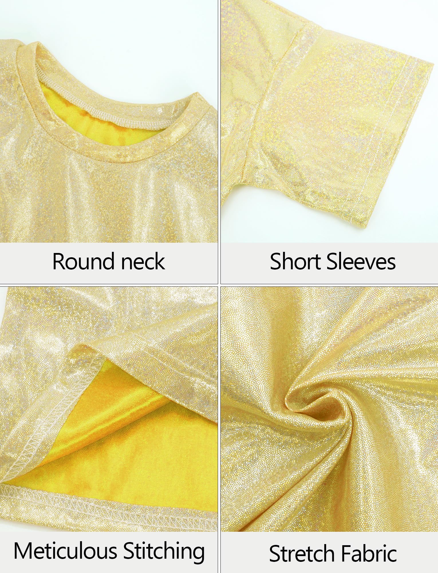 Happy Cherry 2Pcs Kids Girls Shiny Metallic Short Sleeve Crop Top with Pleated Skirt Set Dancewear Performance Costumes Gold 7-8