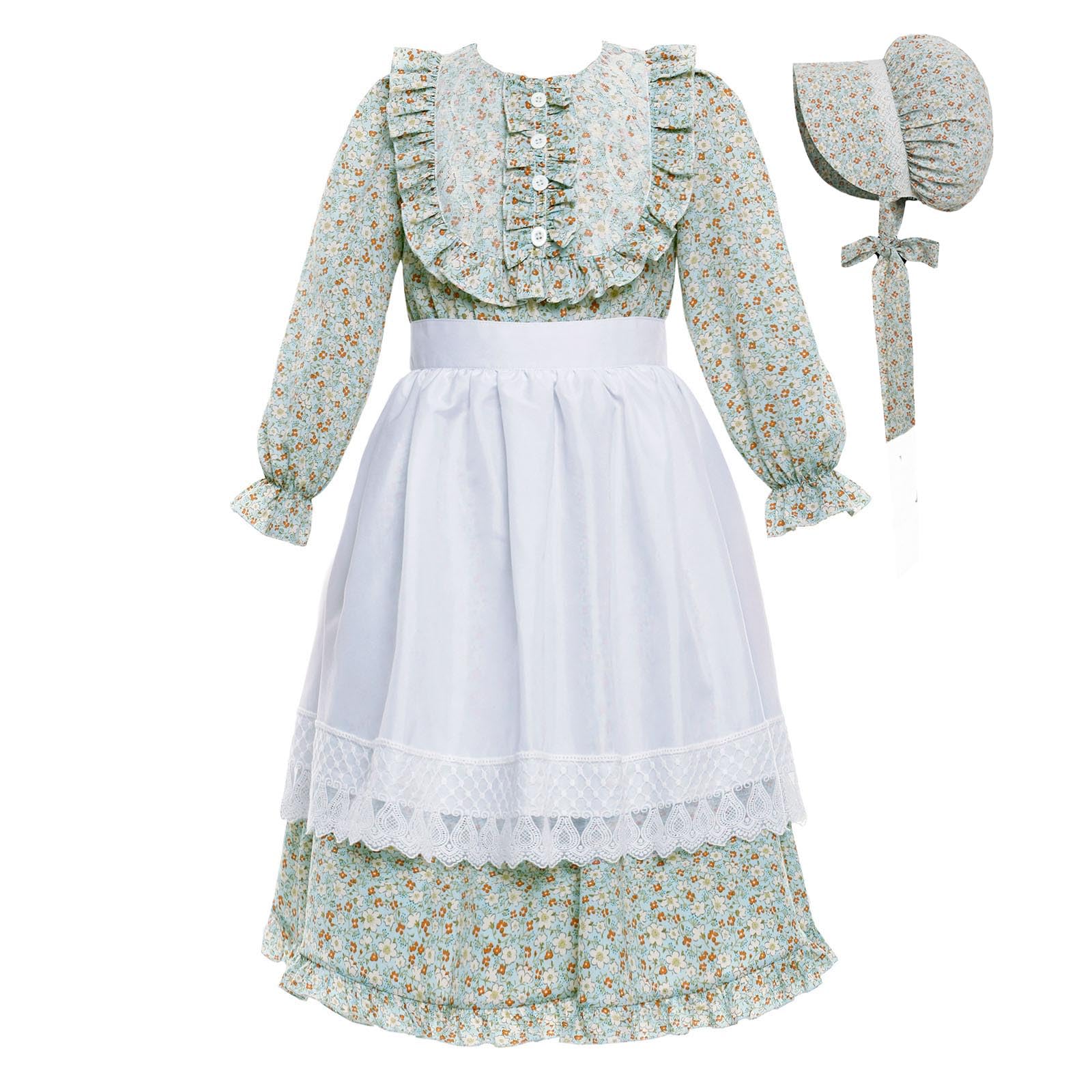 Vibsion Girls Pioneer Prairie Costume Pilgrim Dress Kids Floral Colonial Village Girl Costumes Bonnet Apron Set 3Pcs Xxl