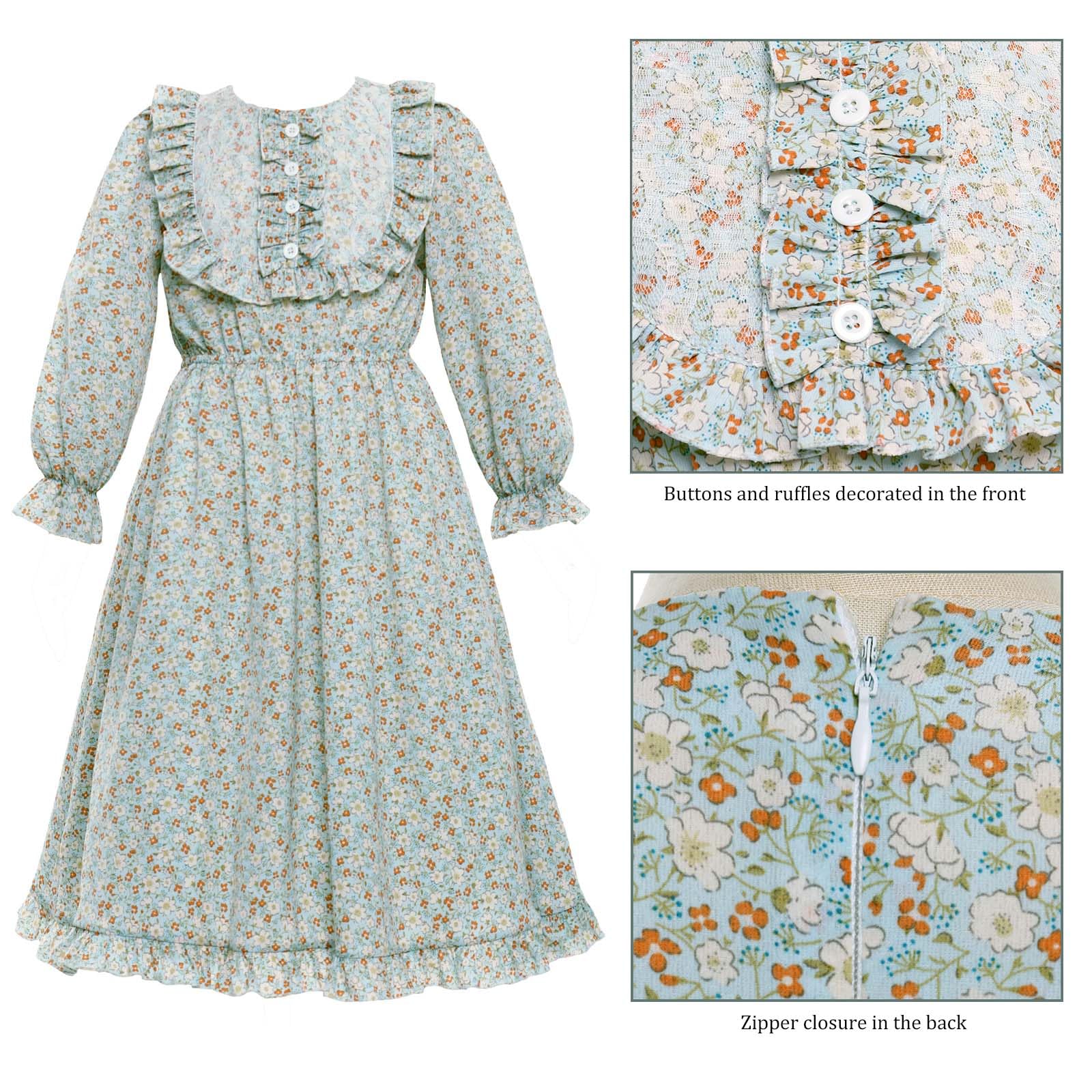 - Material: 100% chiffon. The fabric we use is comfortable, breathable and light-weighted. The colonial dress is flowy and not see-through. Your girl won't feel itchy or anything. | - Design: Long sleeves with elastic cuffs, crew neck, cute flower printed dress, the front with ruffle and lace trimmed. Attached apron is about 60 inches, tie at the back. | - Three Piece Set Pionner Dresses: A full-length long-sleeved prairie dress, a white apron and a calico bonnet. Delicate floral print, fresh green combines with white apron, make the costume even more adorable. | - Occasion: Perfect for pioneer trek, civil war reenactment cosplay, Colonial Fair, education day, pilgrim, school play, Theater, Thanksgiving, Easter, Halloween, Pioneer Day, etc. | - Pionner / Halloween Choic - Dress up your little girl in this cute pioneer costume for Halloween, who says kids have to be scary at Halloweens,an adorable colonial prairie cutie can also impress people and get lots of candy at trick or treat.