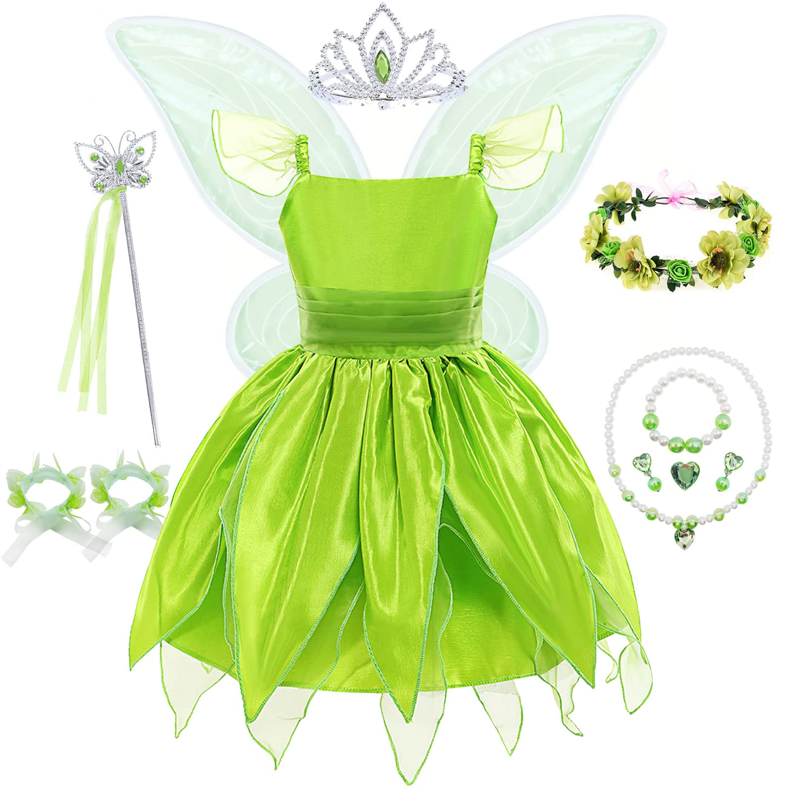 Green Fairy Princess Dresses Condition: New Package includes: princess dress, wings, a pair of flower bracelets, garland, necklace set, crown and wand. Color: green Material: cotton; satin; polyester Features: sleeveless, wide shoulder straps, elastic back waist, puffy skirt hem, zipper closure, removable wings.
