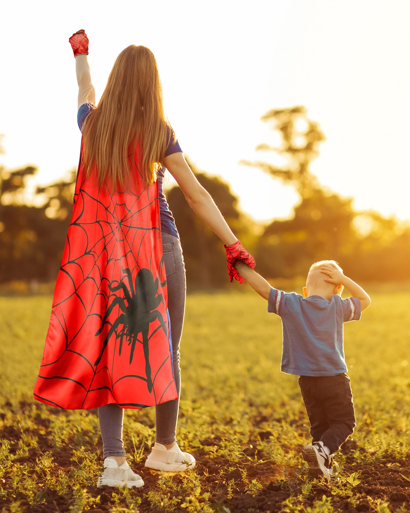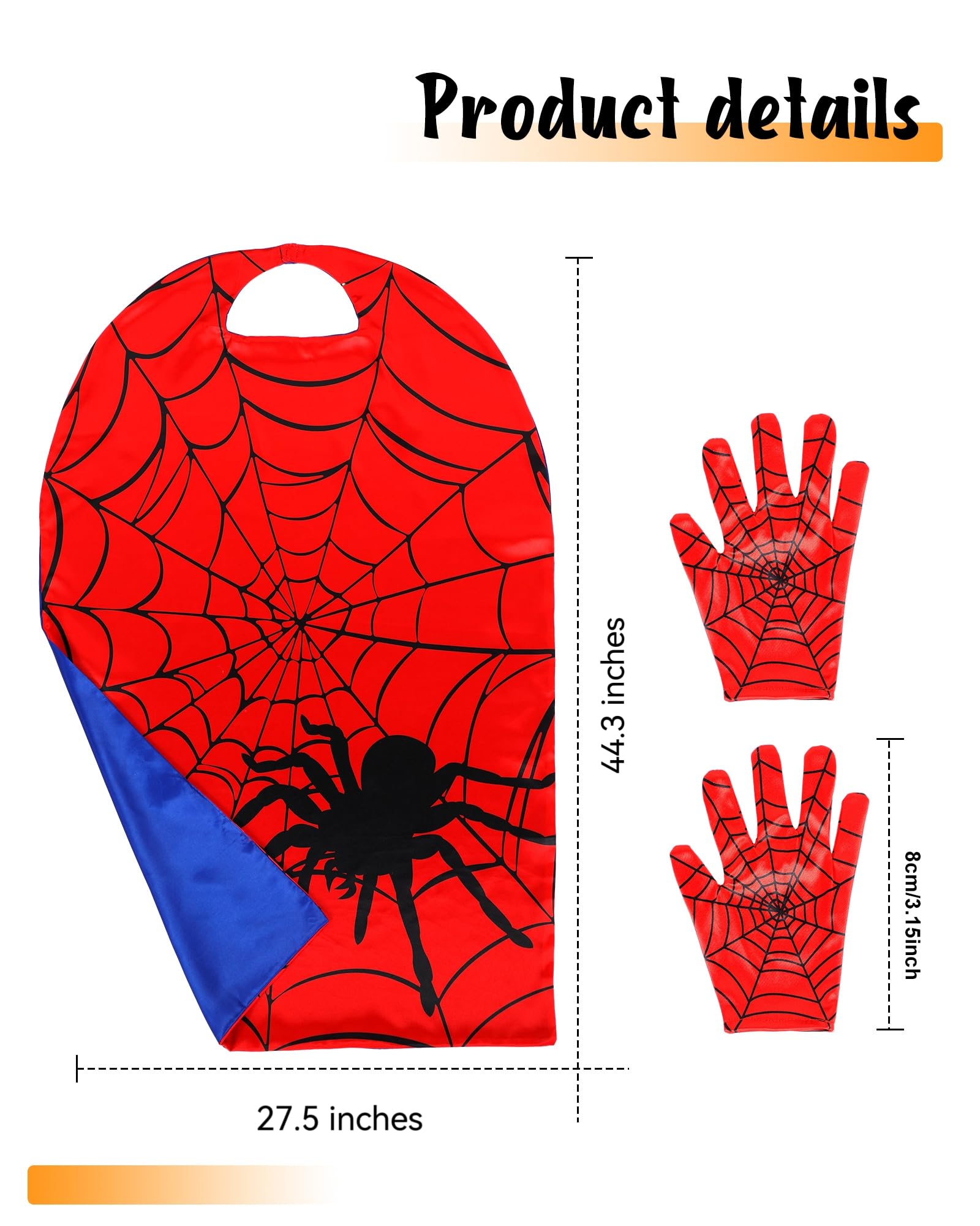 1 Piece spider hero cape and a pair of spider web gloves spider hero costume for Halloween Christmas birthday costume party school performance A good choice for gifts: The cape and gloves costume set is a nice present for boys and girls on Children's Day Halloween Christmas etc. as well as a smart choice for party favors on school performance birthday parties and costume parties. Kids will be immersed in the fun of playing role of a hero to save the world. Specifications. Color: red and black Size: Hero capes: 27. 5 x 27.5 inches (L x W) Gloves: approx. 9 inches in length Material: satin warp knitting spandex Package includes: 1 x Spider hero cape 1 Pair of spider web gloves Warm note: Please allow about 1-2 cm error due to the manual measurement. mature-themed supervision is needed in case of choking hazard.