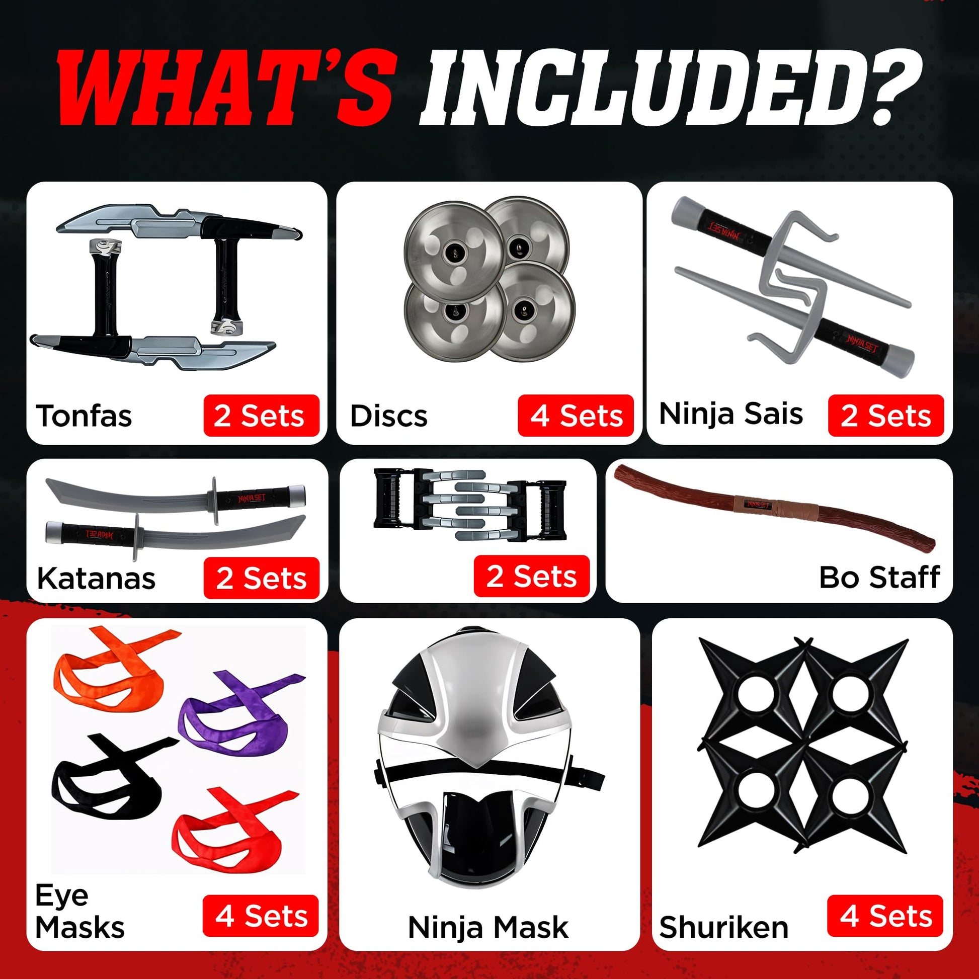 Stealthy little ninjas need to make sure they are prepared for battle. This all inclusive ninja play set is filled with all kinds of and fun for pretend play! This is a great toy set for your child to learn dress up and play as well as to share with friends! Complete their Halloween costume and they'll be ready to become a silent and steathy shinobi! The hard-molded plastic decorative replica blades sais and Bo Staff are designed to withstand epic battles. Please note that all weapon and protective covering pieces are toys for kids' pretend play only and are not real . mature-themed supervision is recommended during playtime to ensure the utmost safety. Whether your little one wants to complete their Halloween costume engage in exciting playdates or simply enjoy solo adventures this Ninja Toy Set has got them covered. Watch as your child's imagination soars fostering creativity teamwork and social skills while they learn dress up and play with friends. Equip your stealthy little ninja with the ultimate arsenal of toy and let them experience the thrill of becoming a silent and skilled shinobi! Grab this amazing Ninja Toy Set today and prepare for countless hours of exhilarating fun and adventure.
