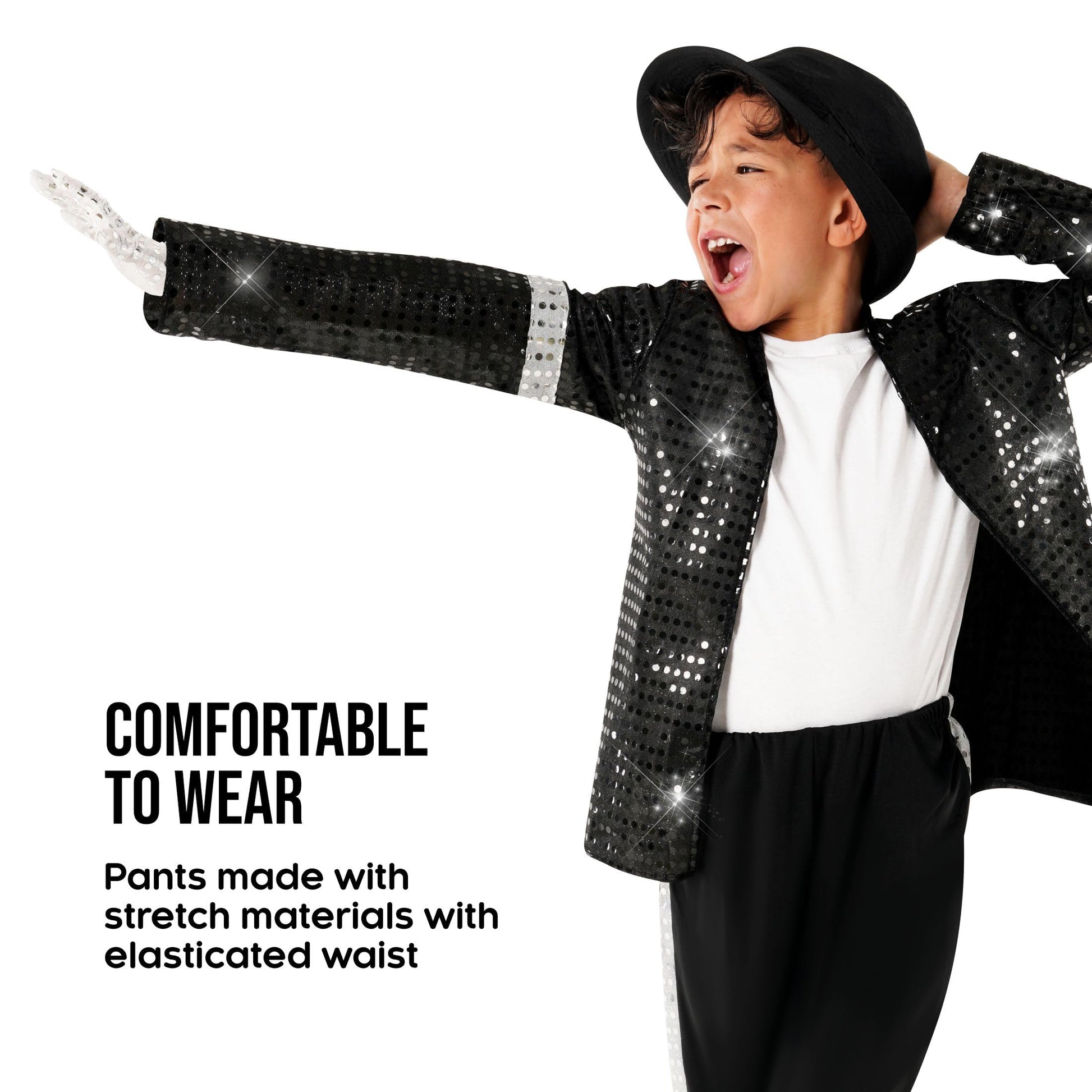 Our Amazing Costume For Kids Includes; Black Dot Confetti Jacket With Silver Stripe, Black Pants With Inserted Socks, Single Silver Metallic Glove And A Styled Hat. This Kids Costume Comes In 4 Sizes: Small, Medium, Large And X-Large. Please Refer To Our Size Guide Found In Images For Further Sizing Information. Give Your Kids The Chance To Embrace Their Inner Popstar Energy With Our Costume! The Jacket Provides A Relaxed Fit, And The Trousers Feature An Elastic Waistband For Easy Wear. Our Costume For Kids Is Ideal For: Halloween Costumes For Kids, Boys Halloween Costume, 80S Costume For Kids, 90S Kids Fancy Dress, Kids, Pop Star Fancy Dress Kids