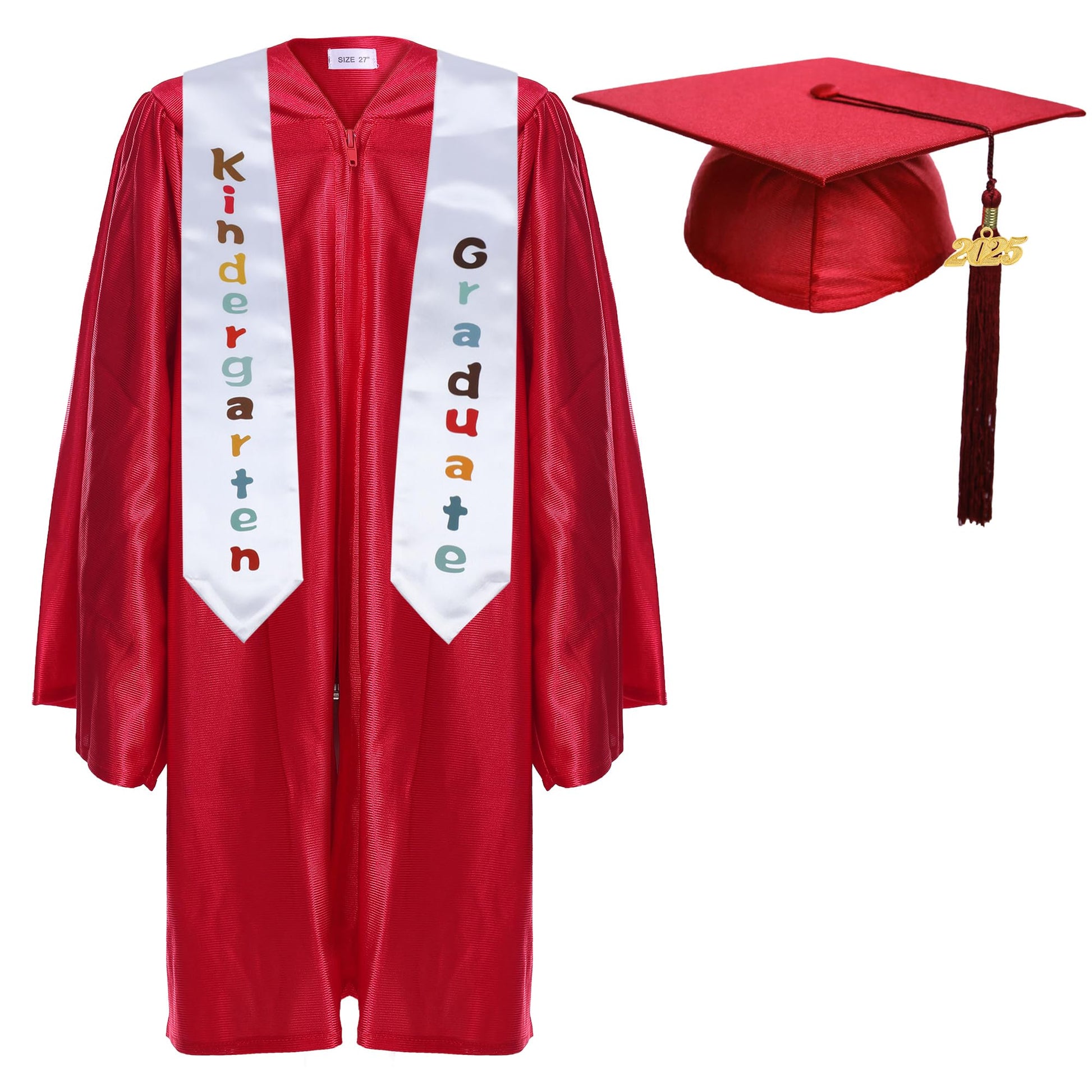 Newrara Kindergarten Graduation Cap and Gown Stole Package Excellent Quality Material: Thick and smooth shiny polyester. 11 Colors Avaliable: Black, Royal Blue, Navy, Purple, Red, Maroon, Gold, Green, White,Pink,Sky blue. 5 Sizes: Suitable for kids height ranges from 3'3'' to 4'5''. Perfectly fit for kindergarten and prek kids. Popular Style: Sturdy hidden color matching zipper in front, strong center pleats on the front and back shoulders of gown.
