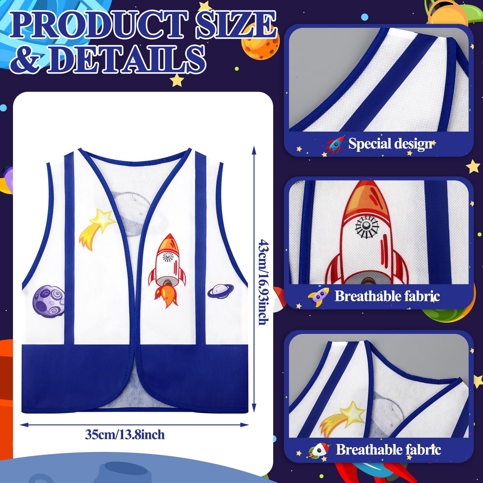 24 Pcs Astronaut Dress Up Vest Astronaut Costume Toddler Outer Space Vest Costume Astronaut Party Favors for Kids Dress Up Space Birthday Party Supplies Multiple usages: Our outer space vest costume is very suitable for class outdoor adventure. It is not only suitable for school activities, but also adds a touch of color to the game. Our space costume can also be worn in other occasions, such as outer space theme parties, birthday parties, stage performances, masquerade parties, cosplay parties, Halloween masquerade parties, and even your daily life. Specifications: Material: polyester Color: main in white and blue Size: 13.8 x 16.9 inches/ 35 x 43 cm Quantity: 24 pieces Package includes: 24 x Vests Note: Manual measurement, please allow slight errors on size. The colors may exist slight difference due to different screens.